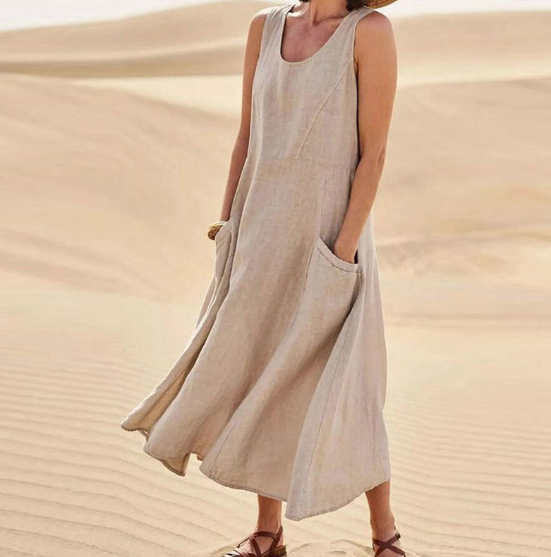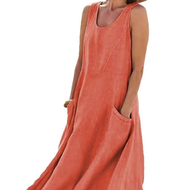 Главная страница > 2025 Amazon Independent Station Лето Европа и США Внешняя торговля карманы без рукавов с круглым вырезом женские хлопковые и льняные платья