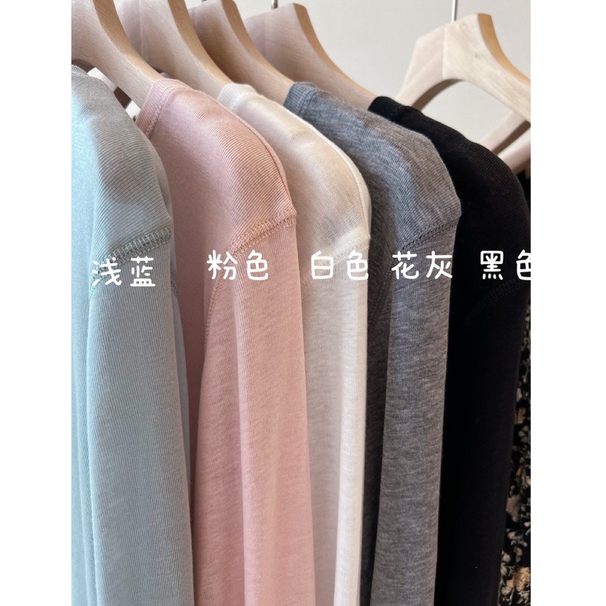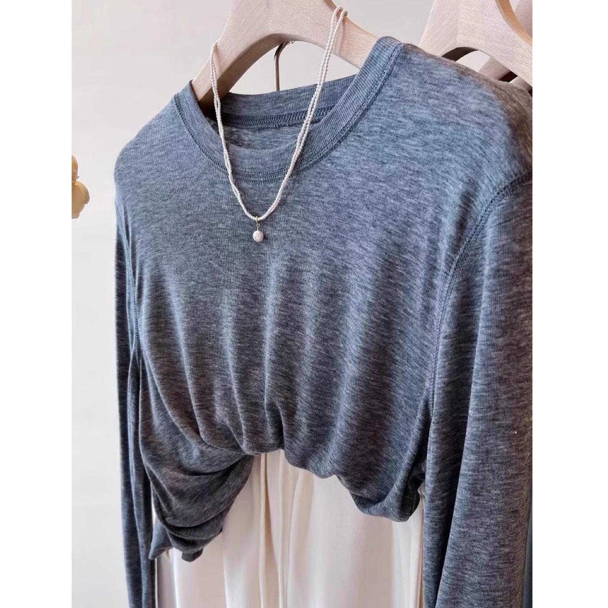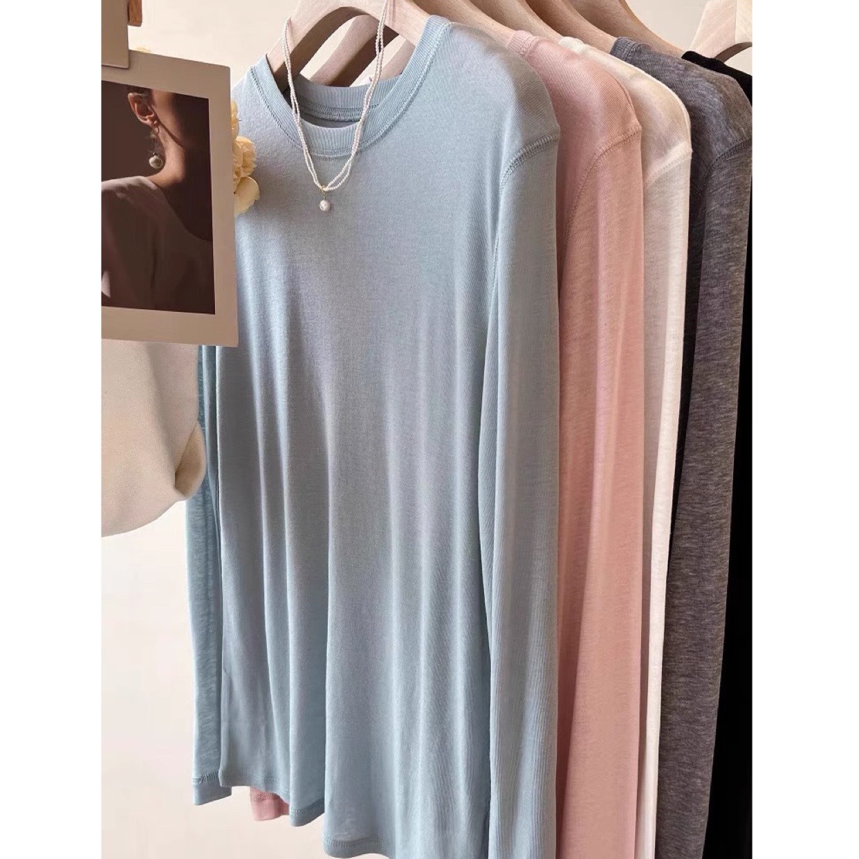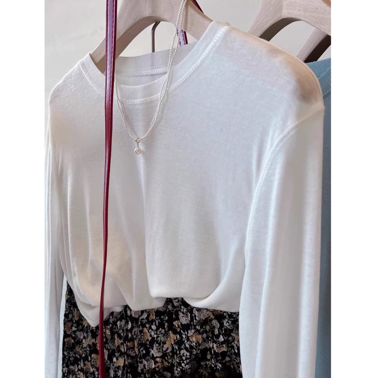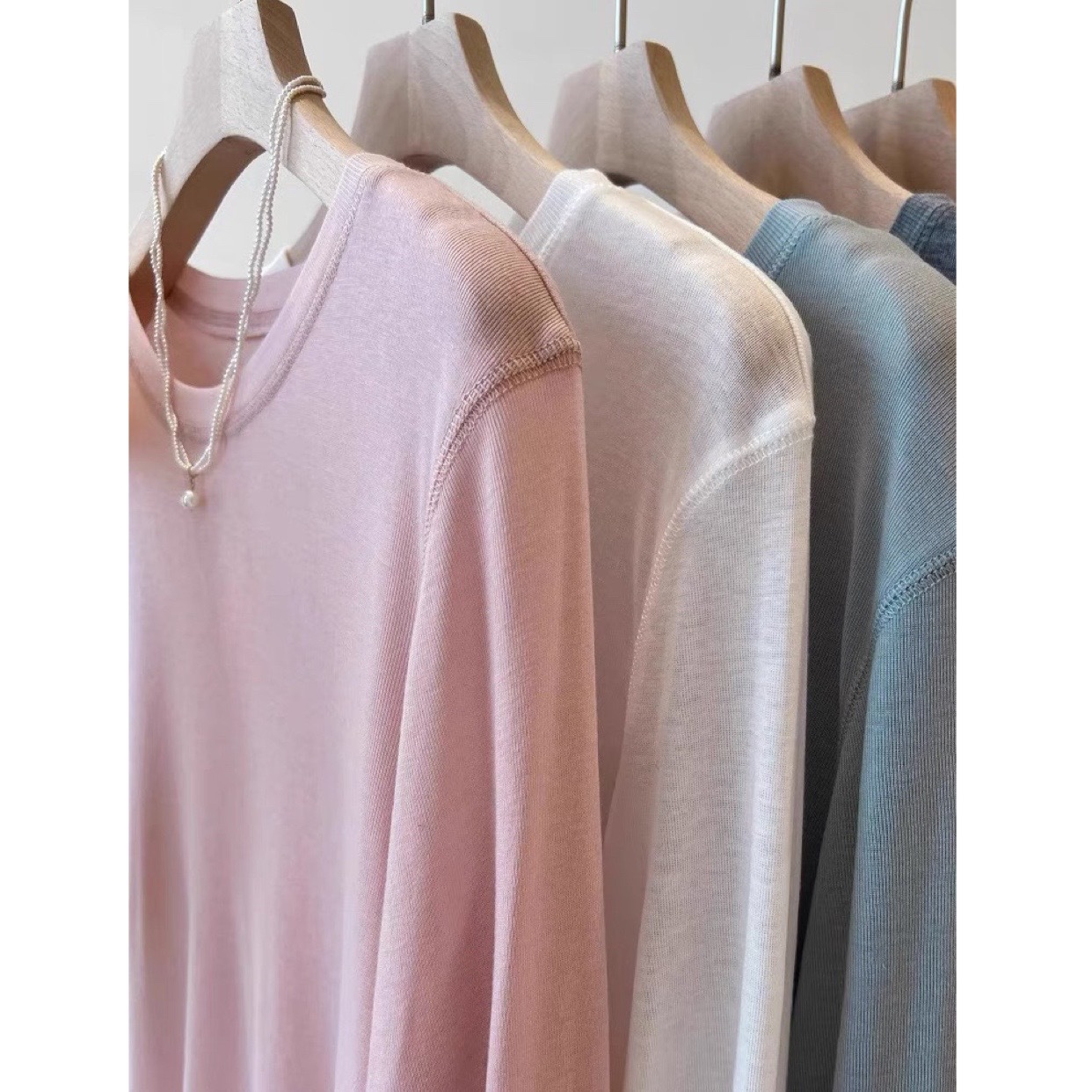 Корейские товары 2023new мягкий хлопчатобумажный 0,7 шерстяной круглый вырез Тяньси сплошной цвет тонкая легкая длинная рукавная маска футболка женская наружная одежда