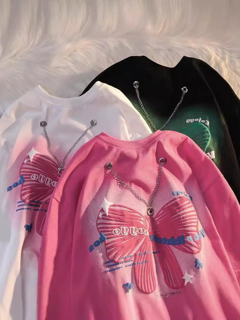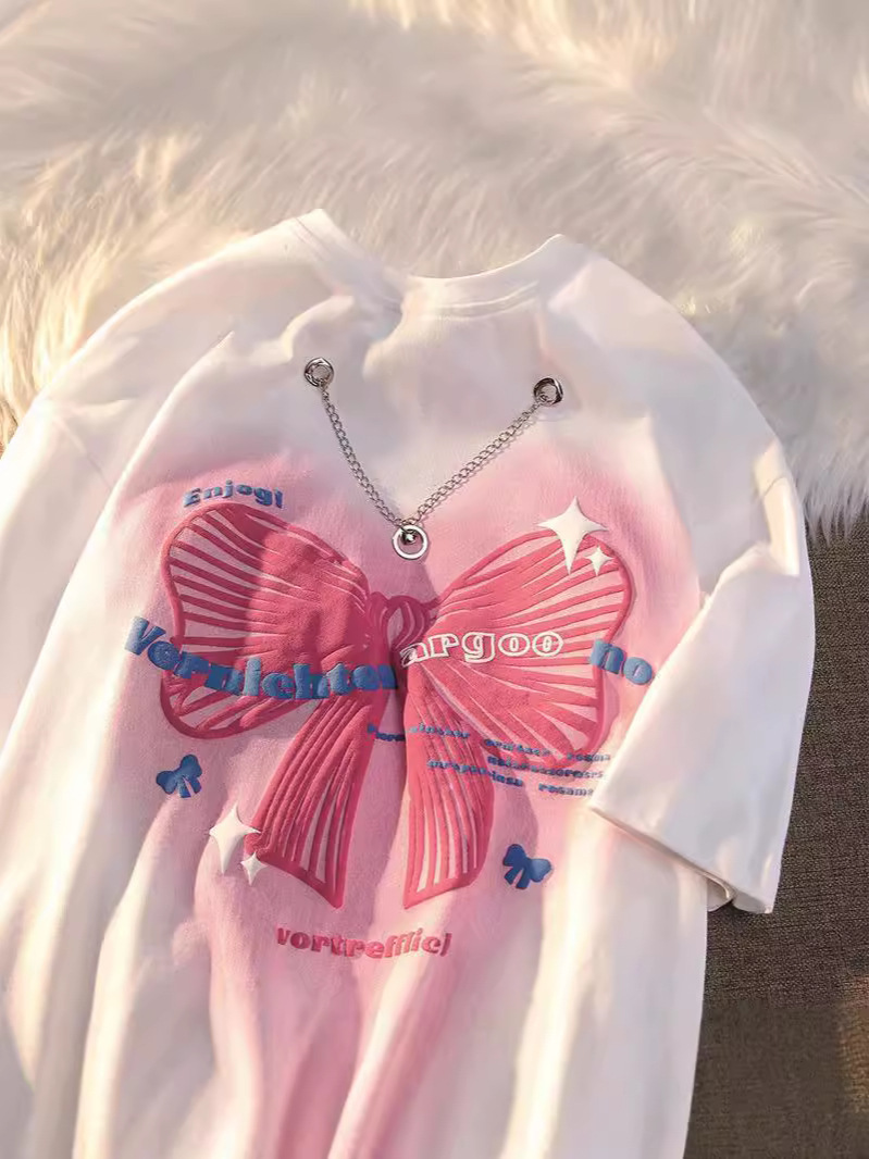 Главная страница > Ожерелье с бантом Футболка с короткими рукавами oversize Летнее чувство дизайна ниши с половиной рукава Девушка пара блузка in