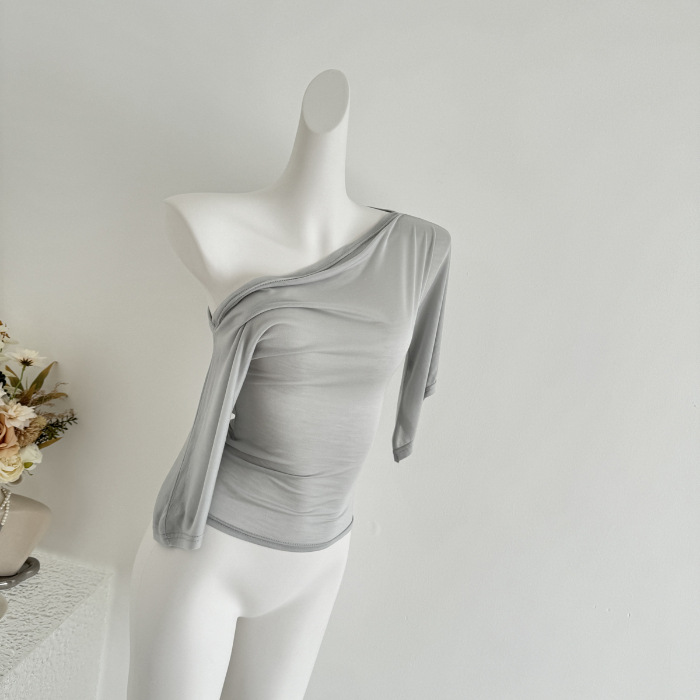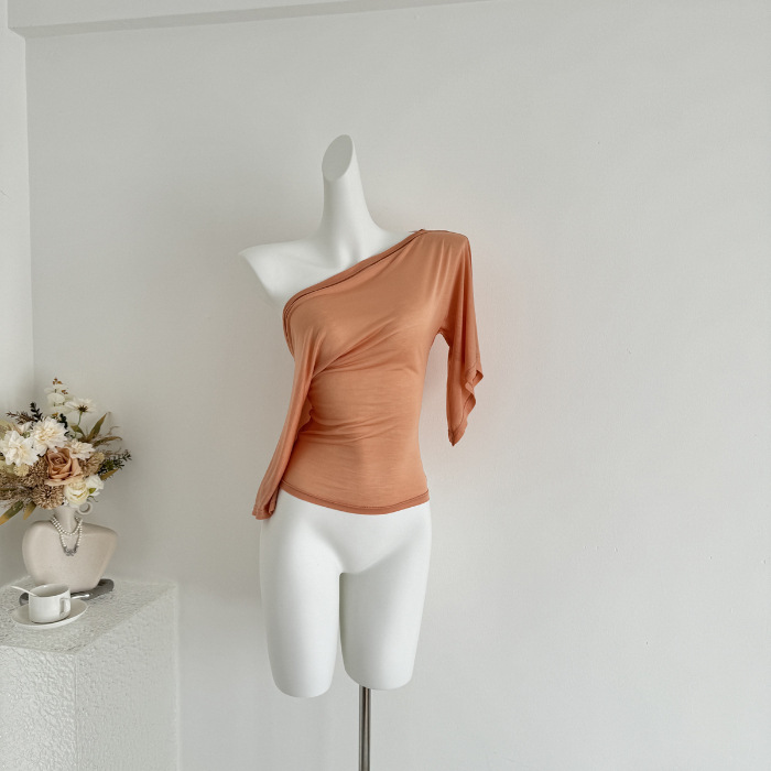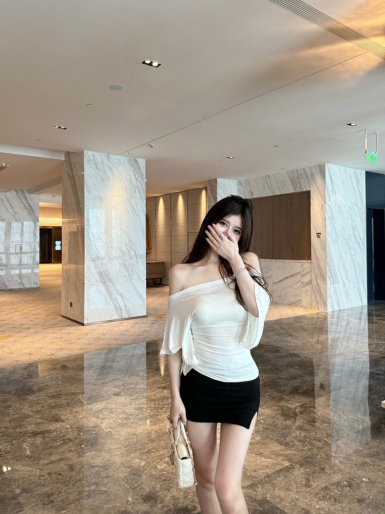 Главная страница > Женская футболка с открытыми плечами из льняного лиоцелла, новая нишевая футболка с короткими рукавами, утягивающая белая футболка для горячих девушек