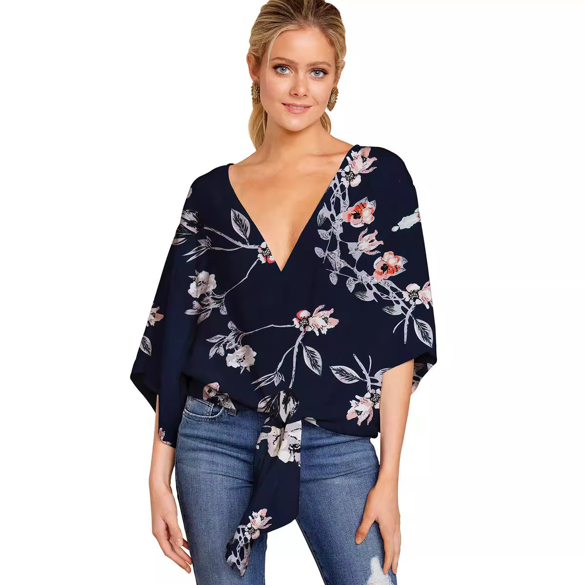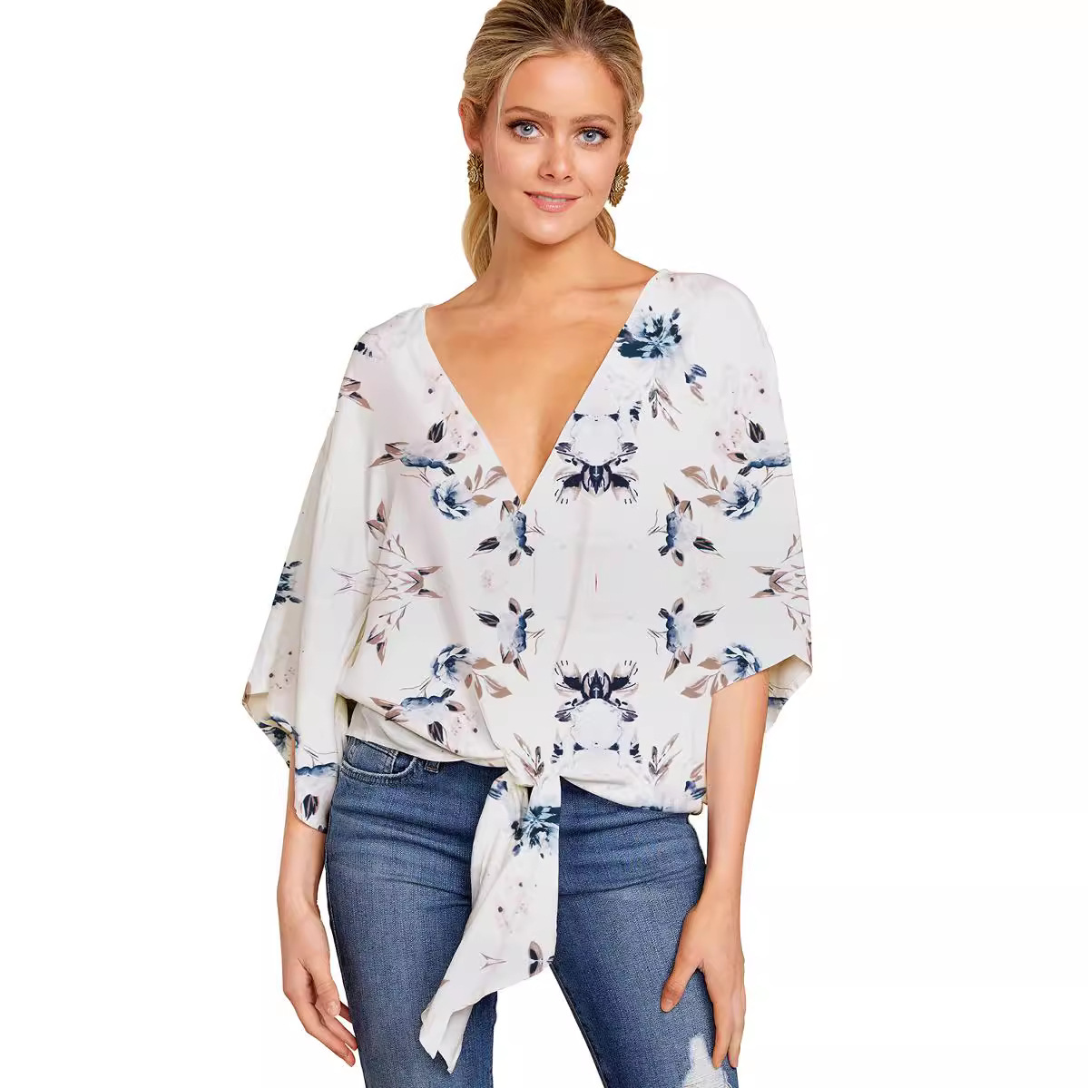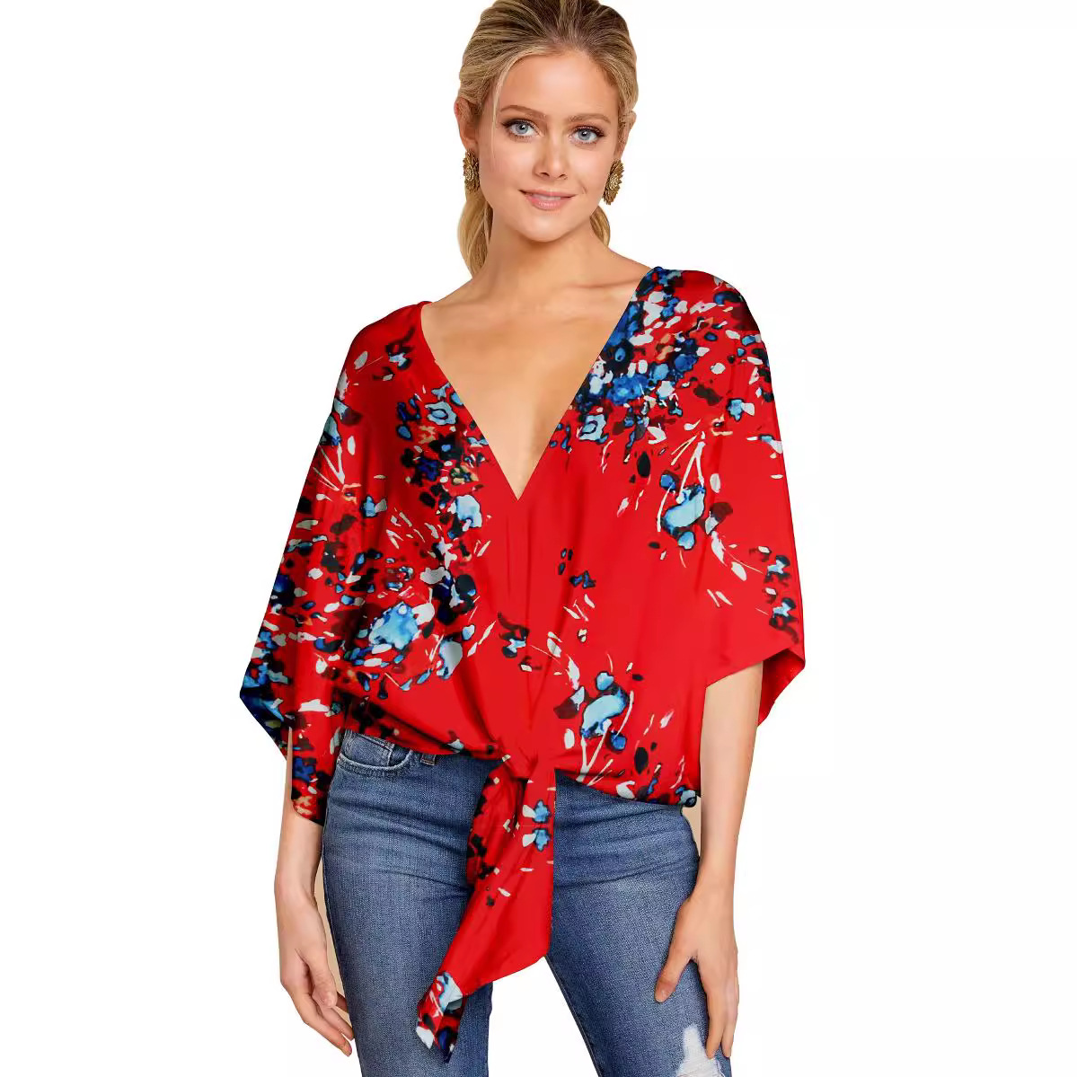 Главная страница > Женская одежда 2024 года для eBay, Amazon, Wish: весенне-летние топы с V-образным вырезом, коротким рукавом, узлом и принтом в европейском и американском стиле.