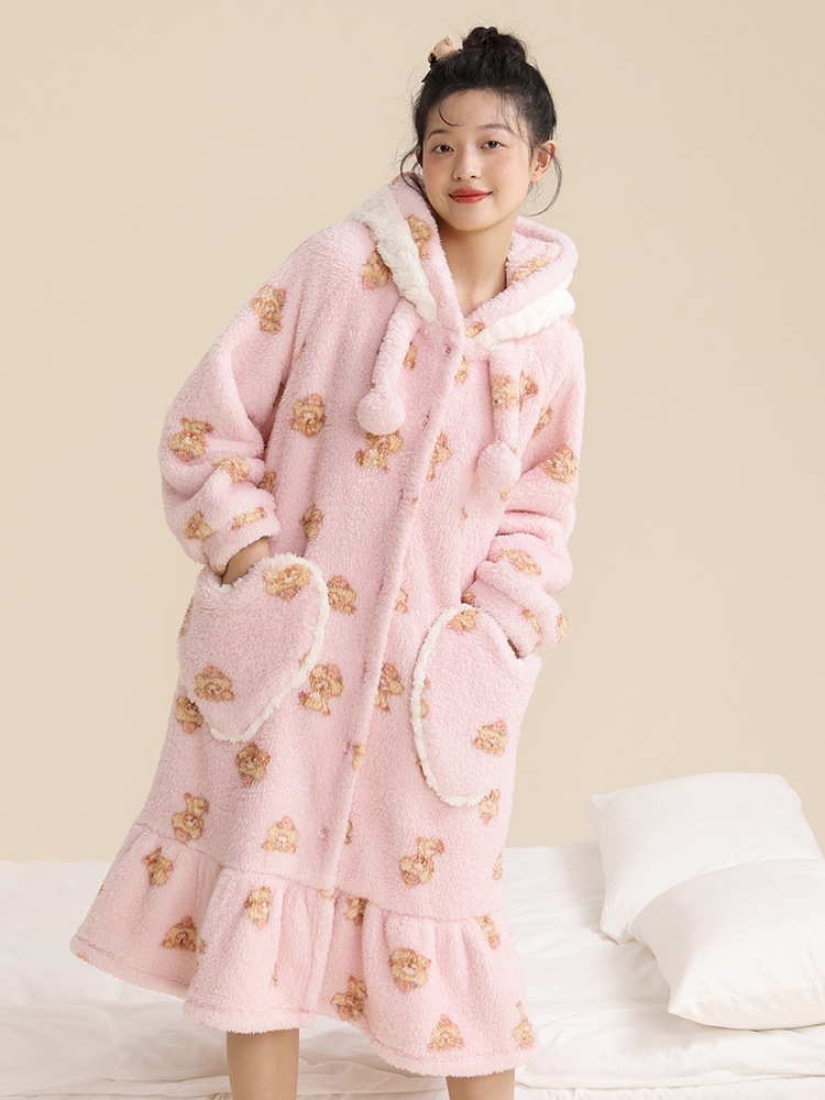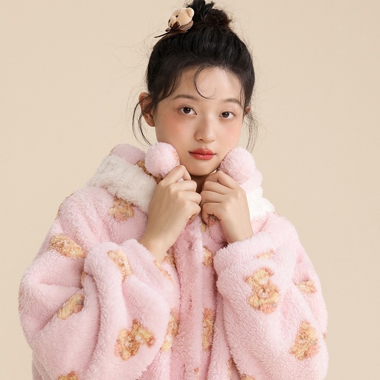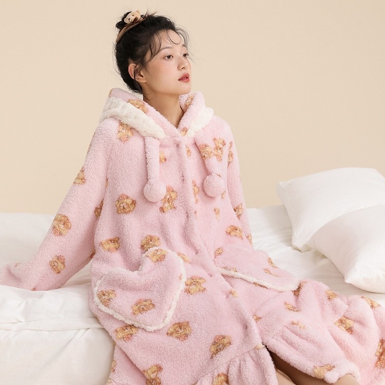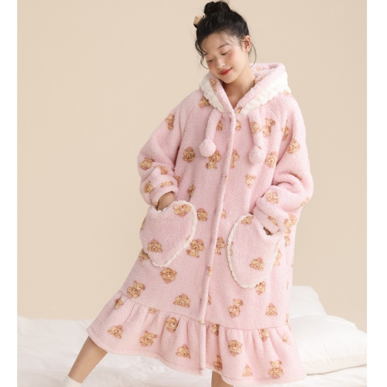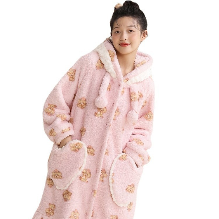 Главная страница > Женская пижама из кораллового флиса и фланели с медведем, осень-зима 2025, можно носить на улице, очень длинная и утолщенная, домашняя ночная рубашка