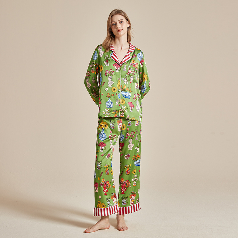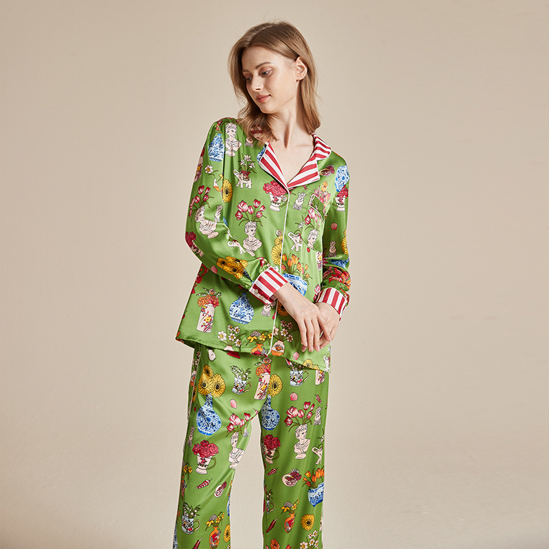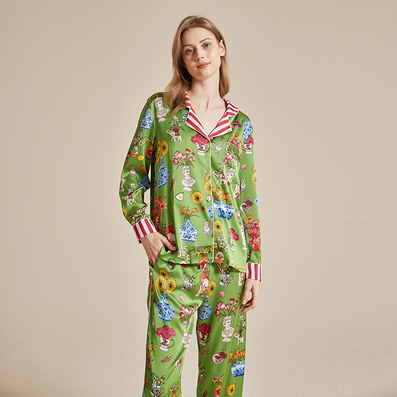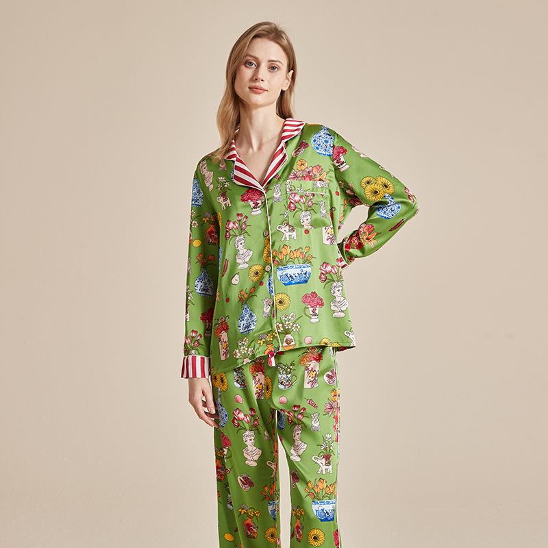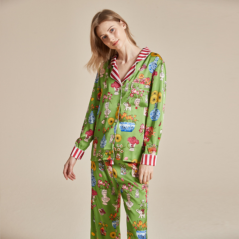 Главная страница > [Зеленая ваза] Весенняя и осенняя пижама для женщин с длинными рукавами кардиган с принтом имитация шелка