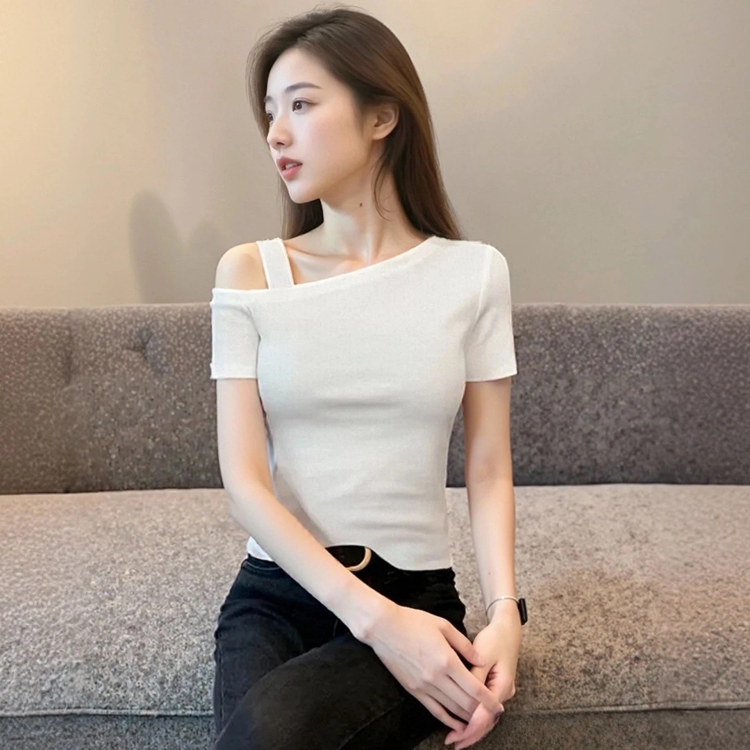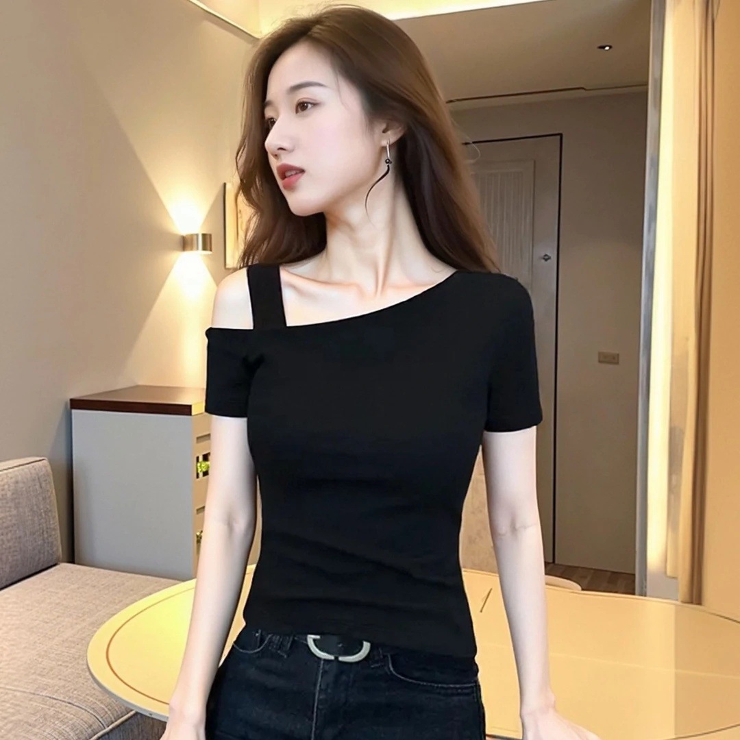 Главная страница > Черная женская летняя корейская версия с половиной рукавов, однотонная футболка с открытыми плечами, женская тонкая базовая рубашка с короткими рукавами, модная
