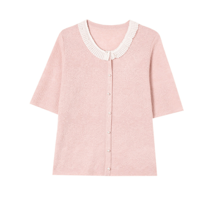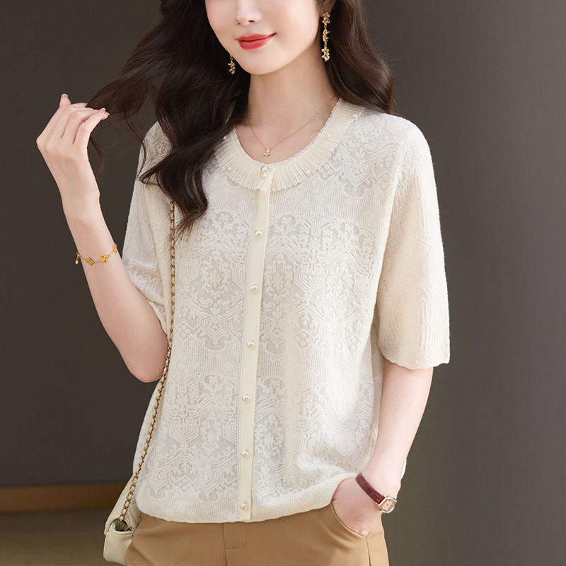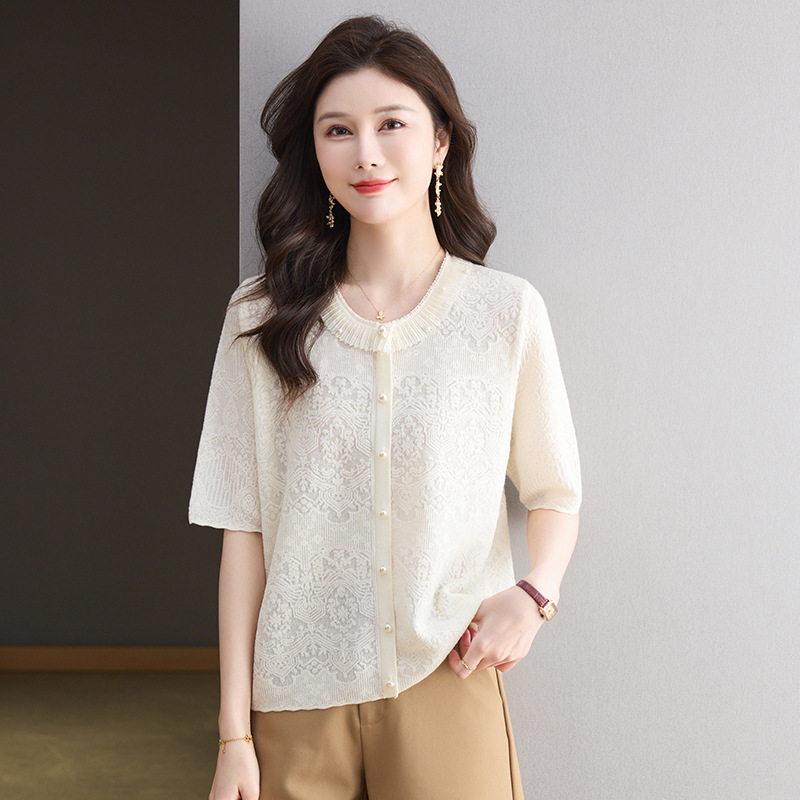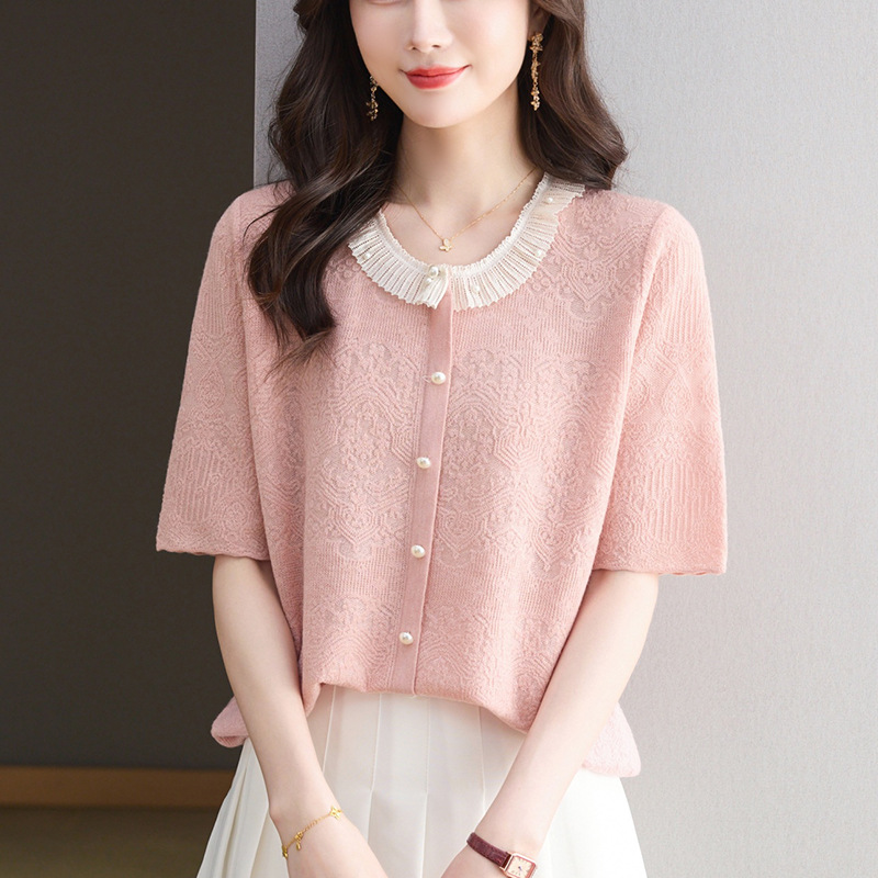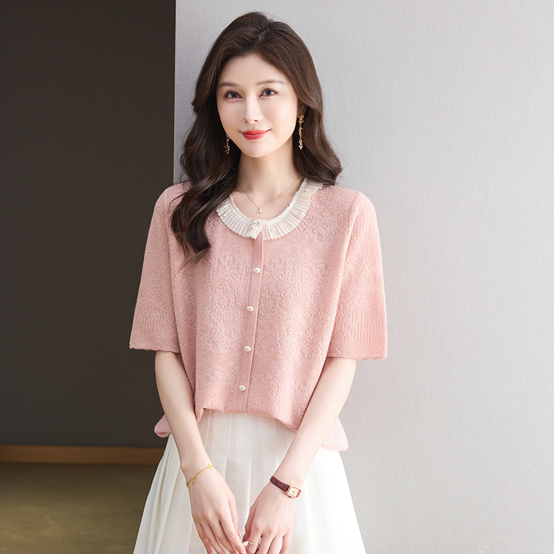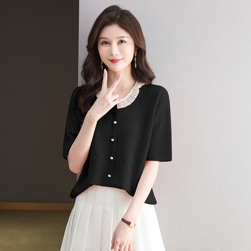 Главная страница > 2025 новый летний жаккард с шерстяным топом темперамент женская футболка с короткими рукавами моды темперамент круглый воротник пуловер маленькая рубашка
