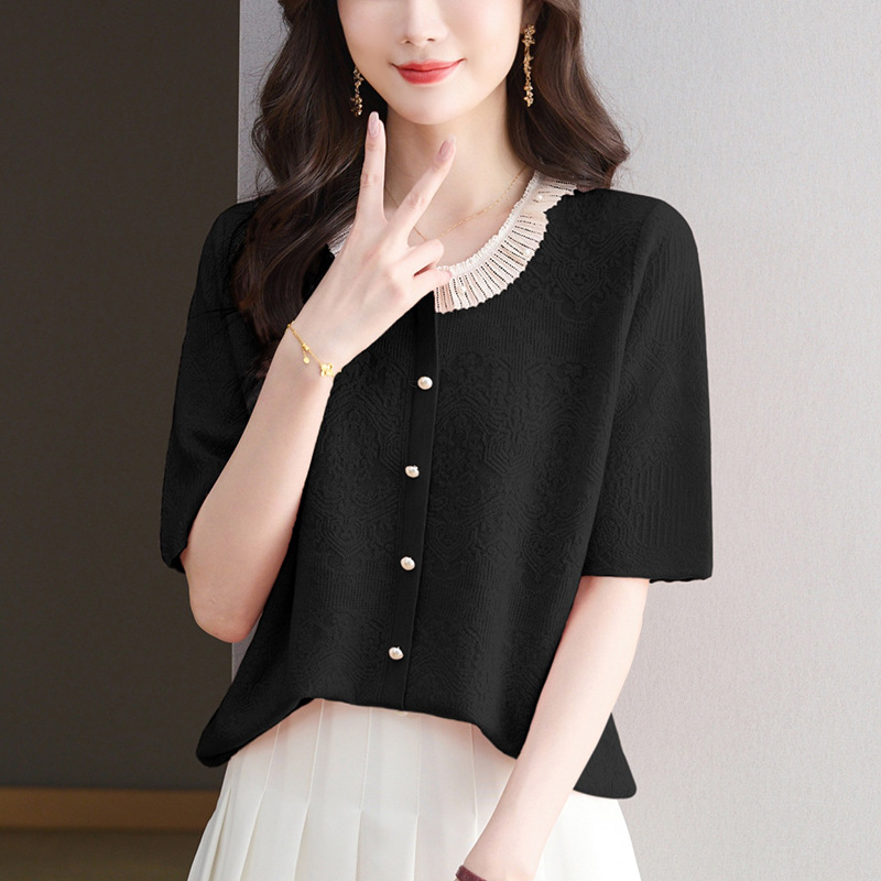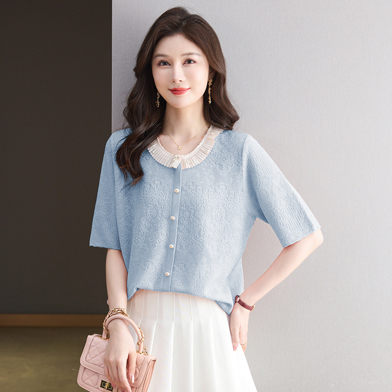 2025 новый летний жаккард с шерстяным топом темперамент женская футболка с короткими рукавами моды темперамент круглый воротник пуловер маленькая рубашка