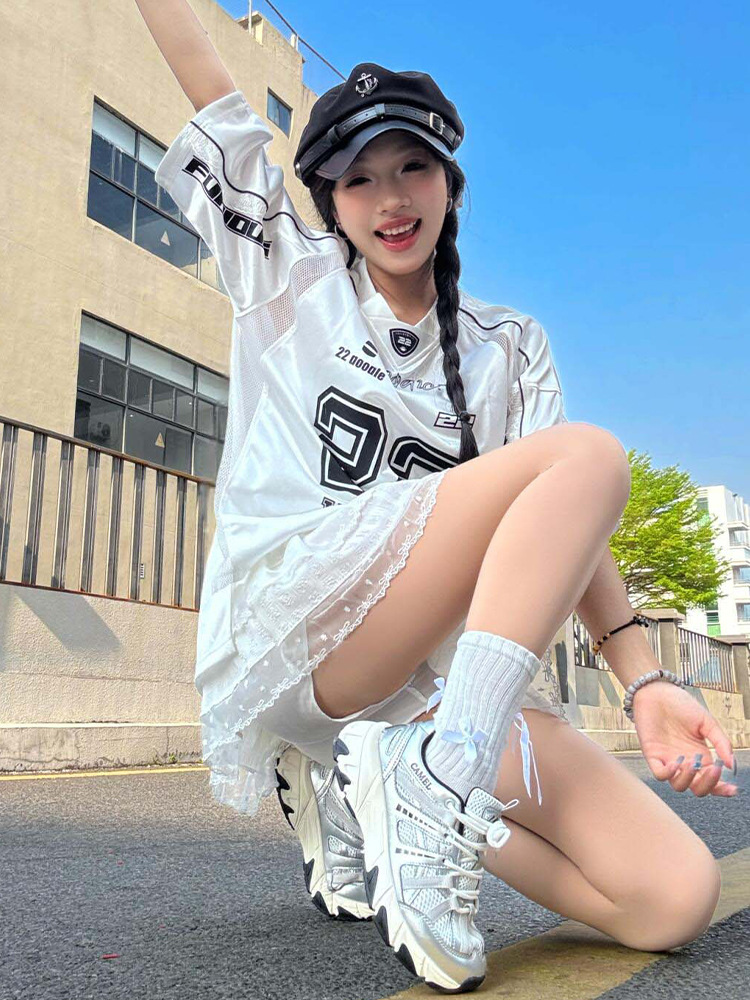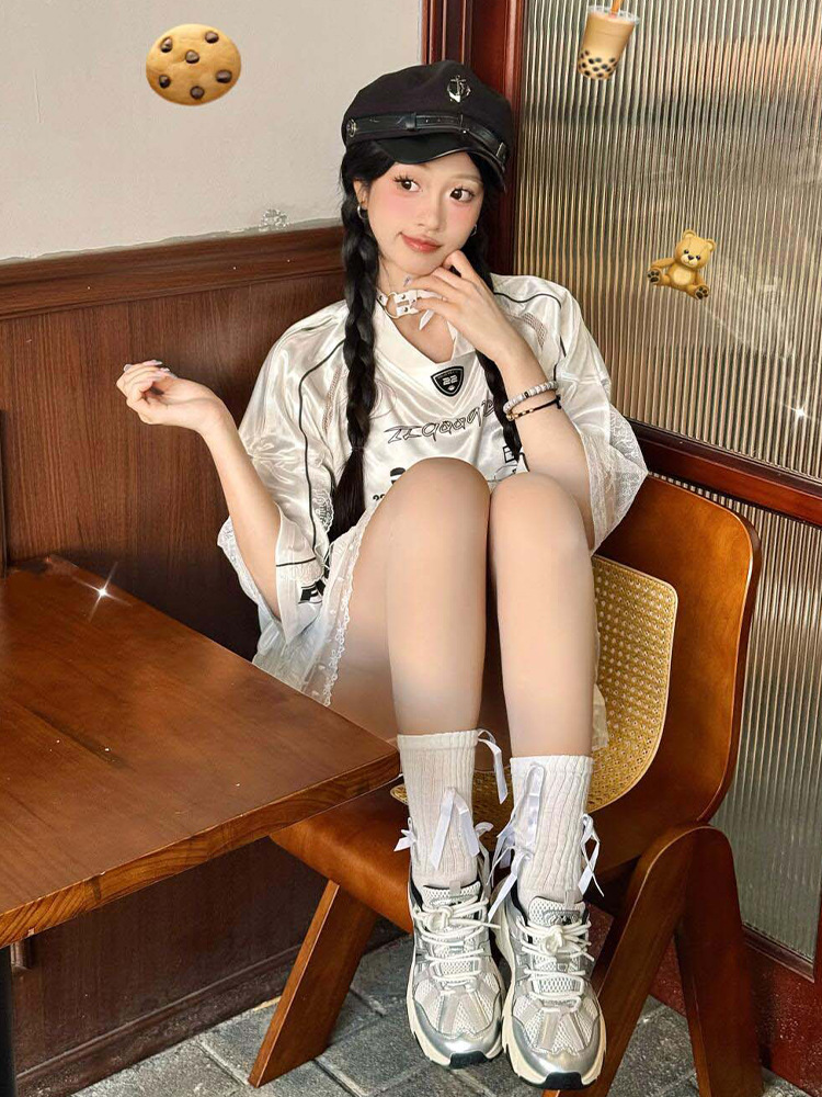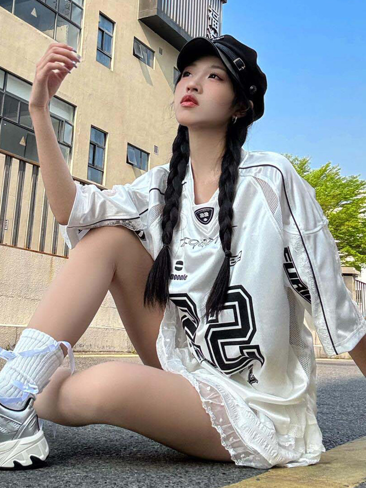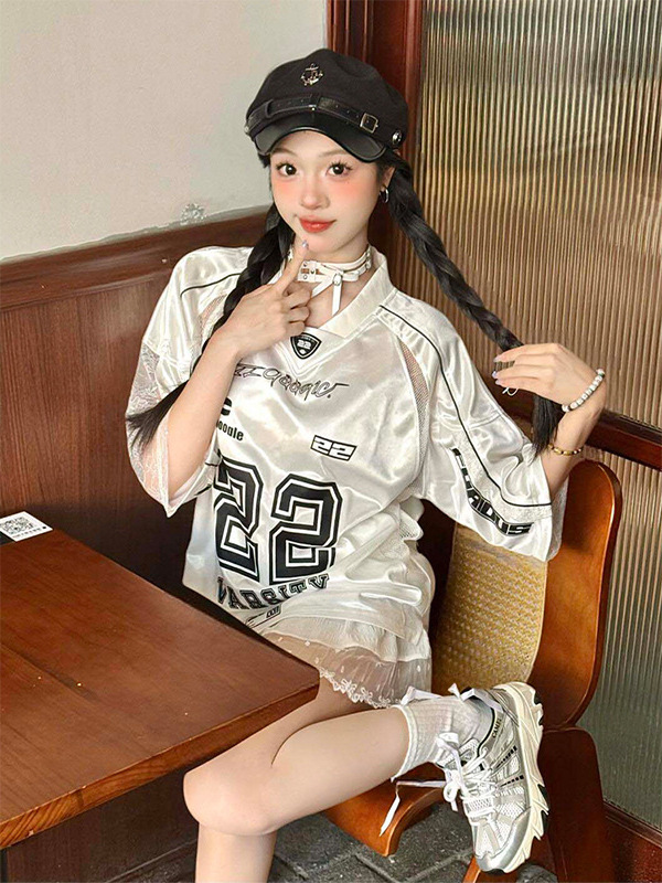 Главная страница > Глянцевая кружевная женская футболка с короткими рукавами, летняя модная уличная американская свободная футболка с дизайном, повседневный топ