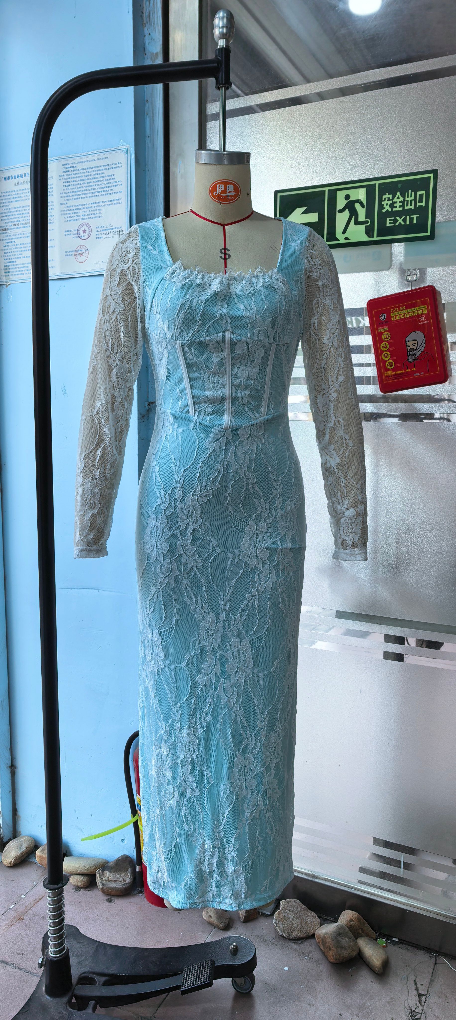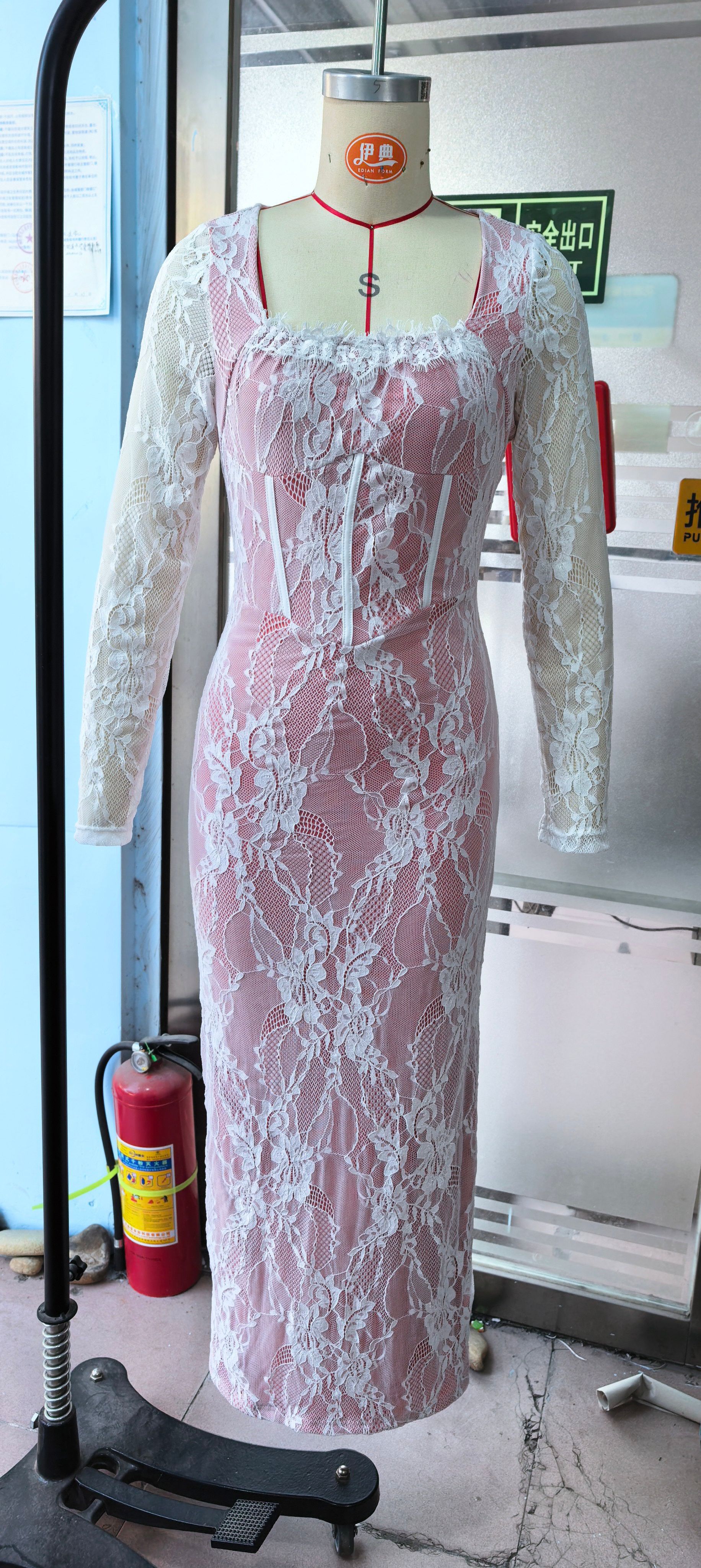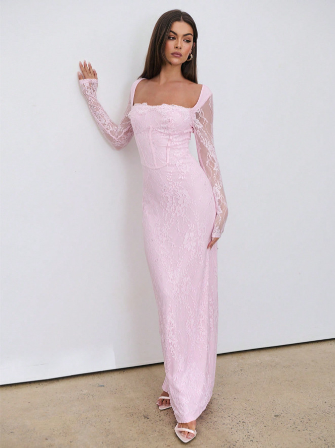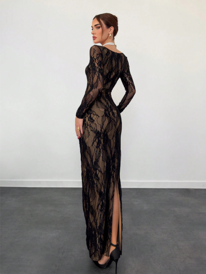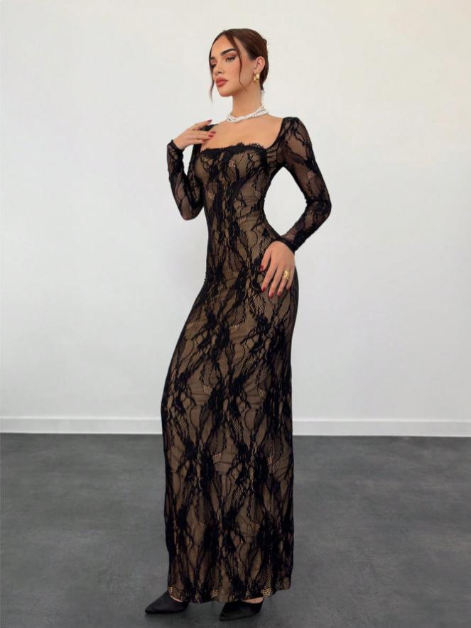 Главная страница > Платье Xiyin Amazon 2025 с квадратным вырезом, кружевными вставками, разрезом, приталенное, облегающее, с длинными рукавами, на молнии