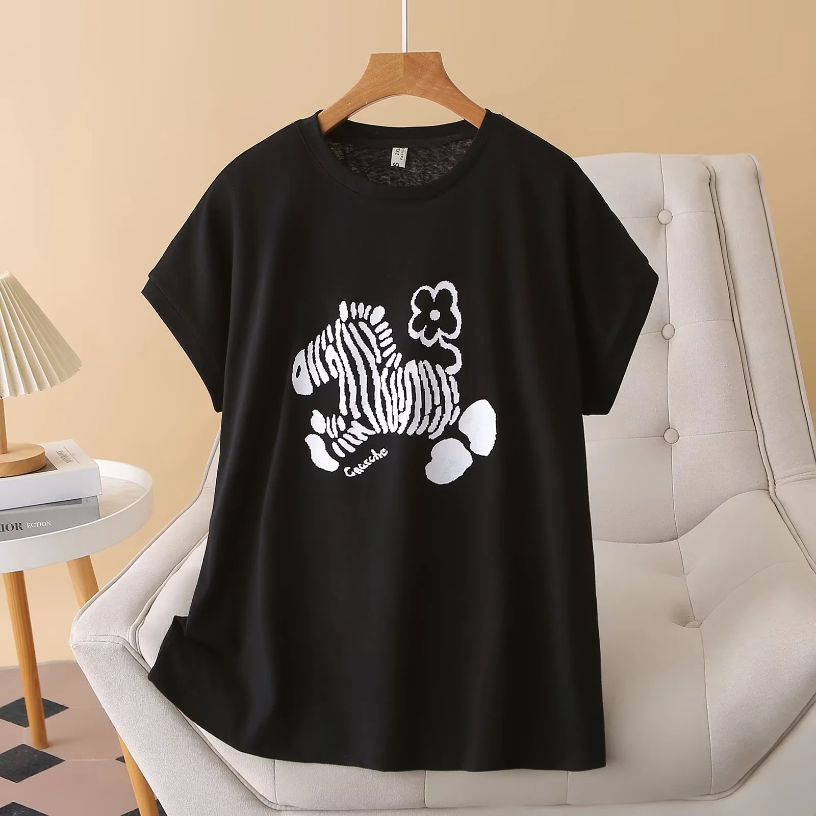 Женская футболка с коротким рукавом, круглым вырезом, хлопковая, с принтом снежинок и пони, размер М плюс, весна 2025, H71967