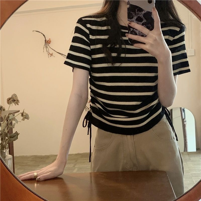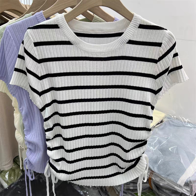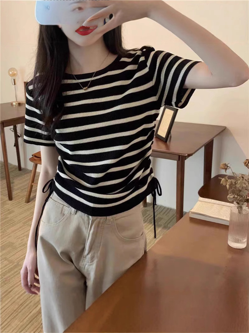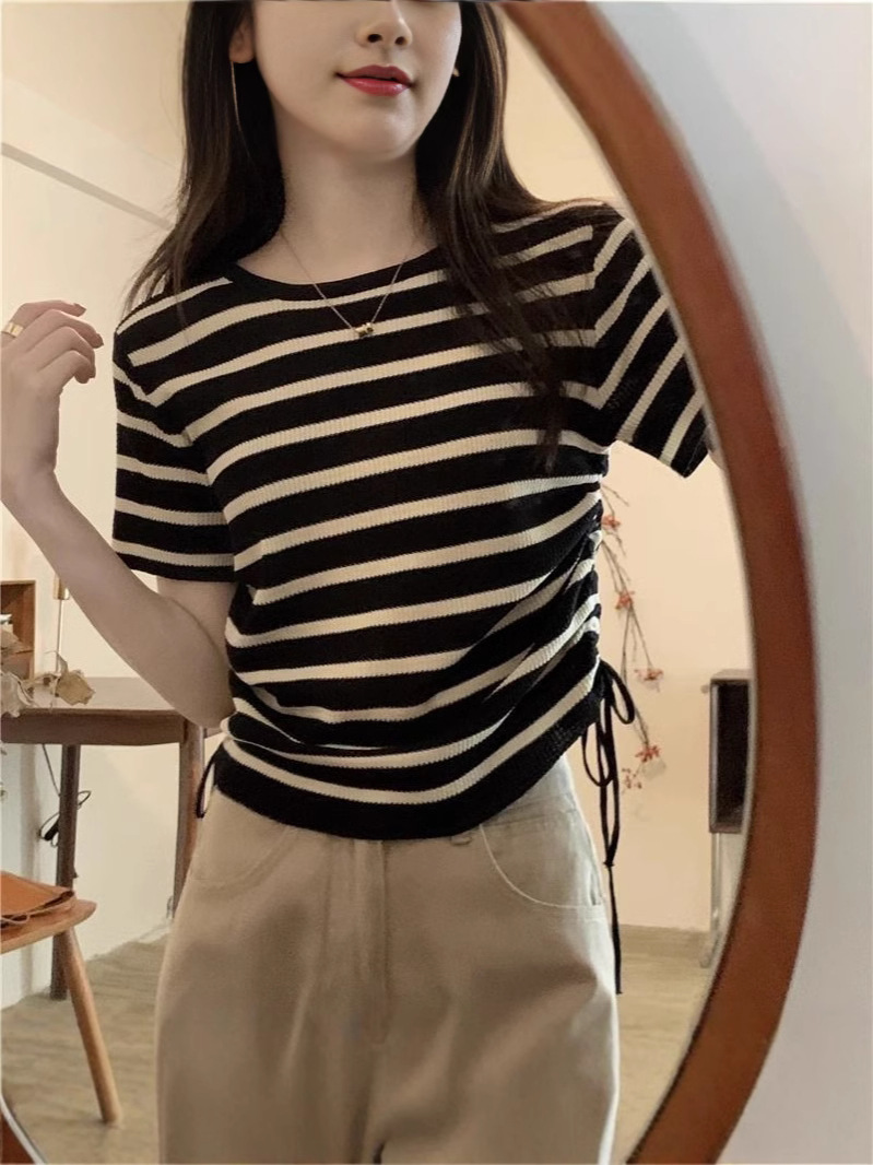 Главная страница > Летние новые уменьшенные талии шнуровка в полоску трикотаж женская футболка с короткими рукавами тонкая универсальный дизайн топ женский