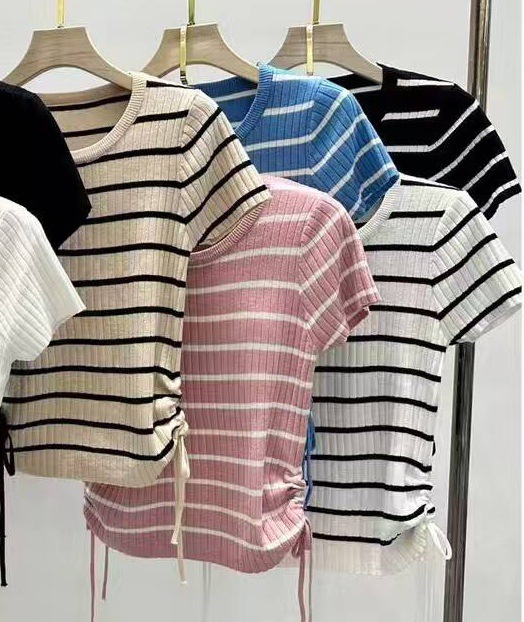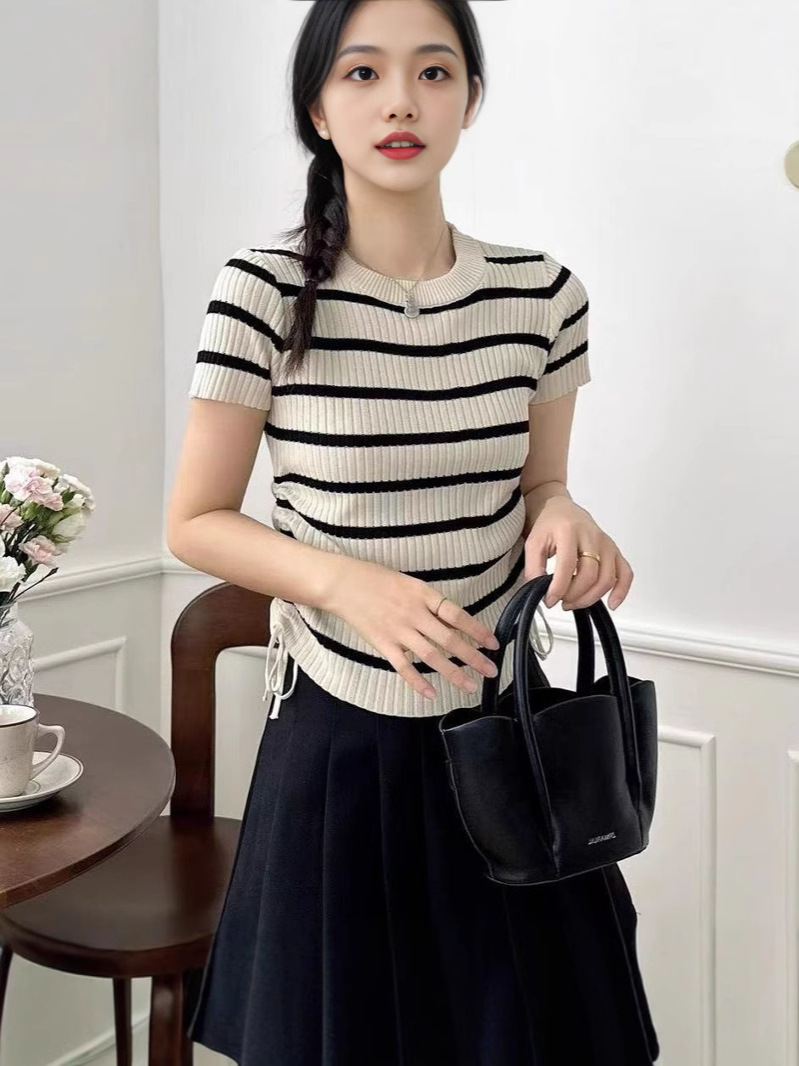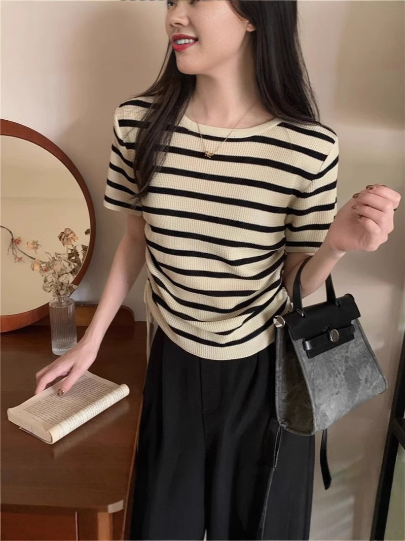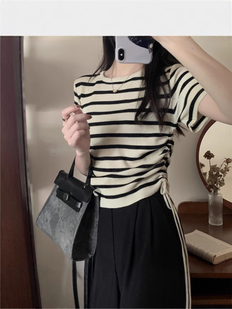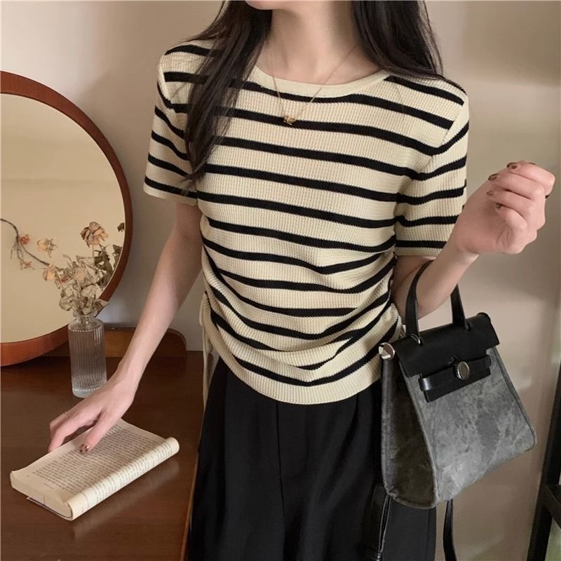 Главная страница > Летние новые уменьшенные талии шнуровка в полоску трикотаж женская футболка с короткими рукавами тонкая универсальный дизайн топ женский