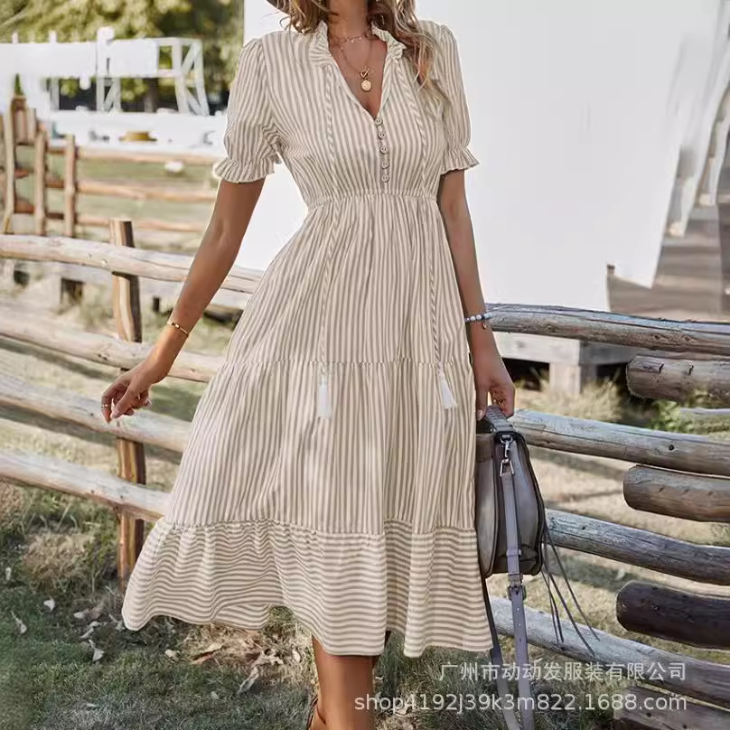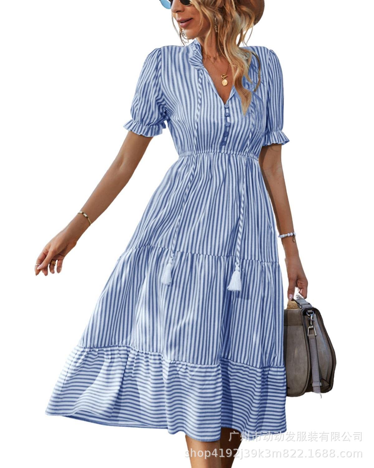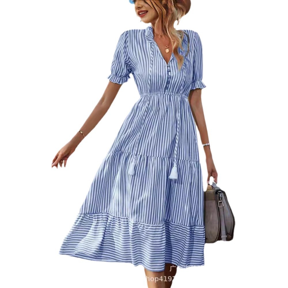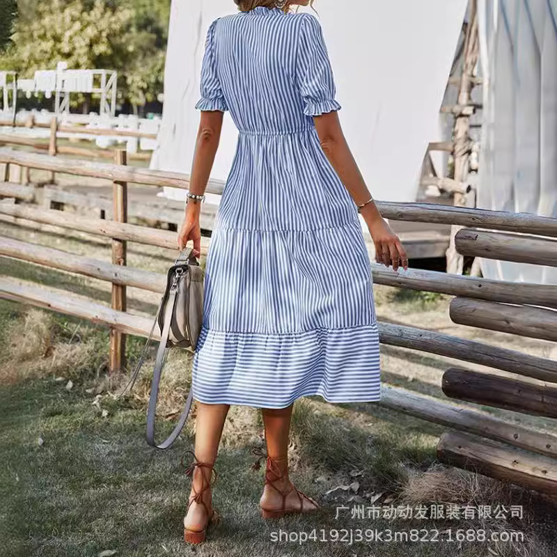 Главная страница > Трансграничное AliExpress 2022, Европейская и американская мода, летнее женское платье в полоску с короткими рукавами и V-образным вырезом, талия, женская одежда