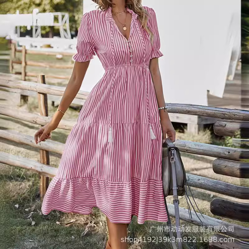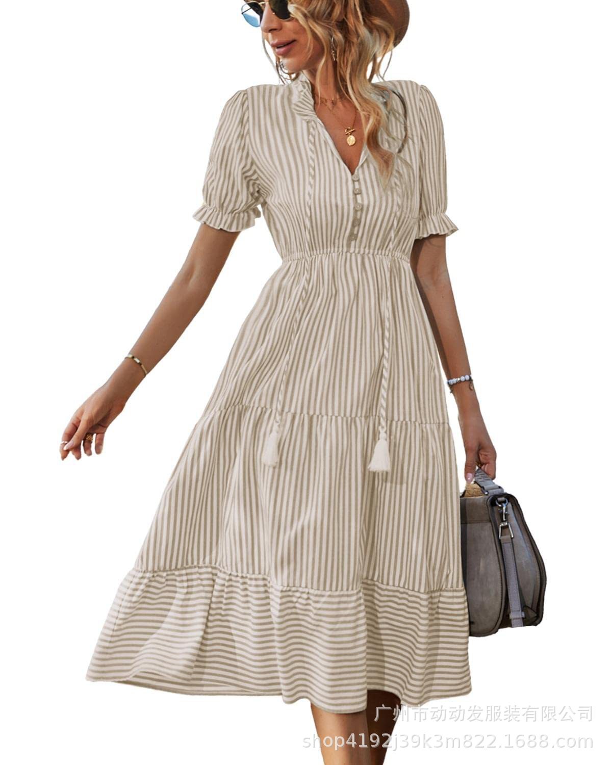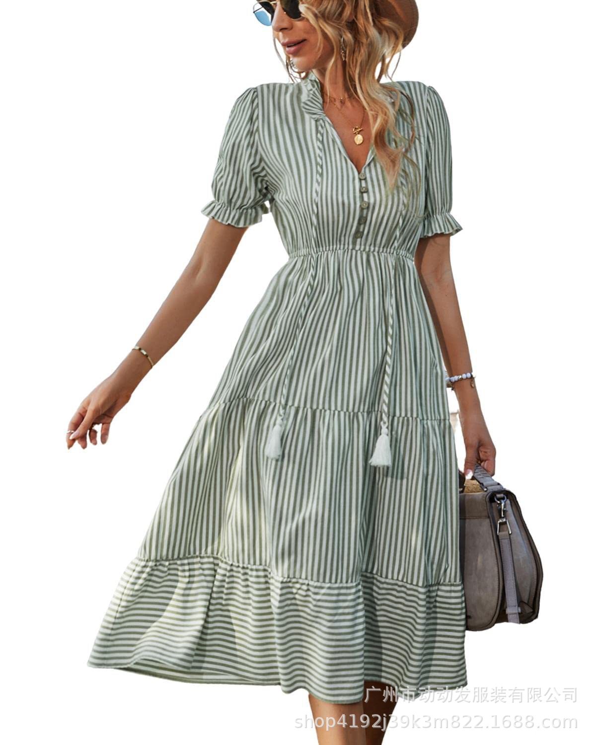 Главная страница > Трансграничное AliExpress 2022, Европейская и американская мода, летнее женское платье в полоску с короткими рукавами и V-образным вырезом, талия, женская одежда