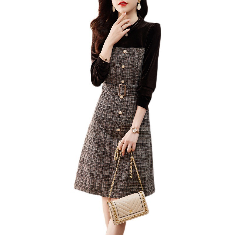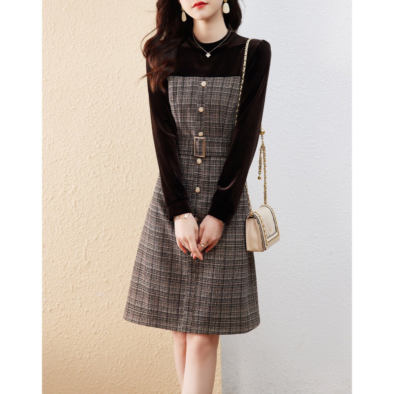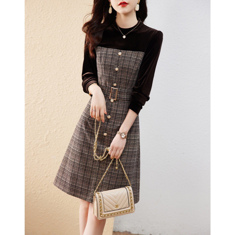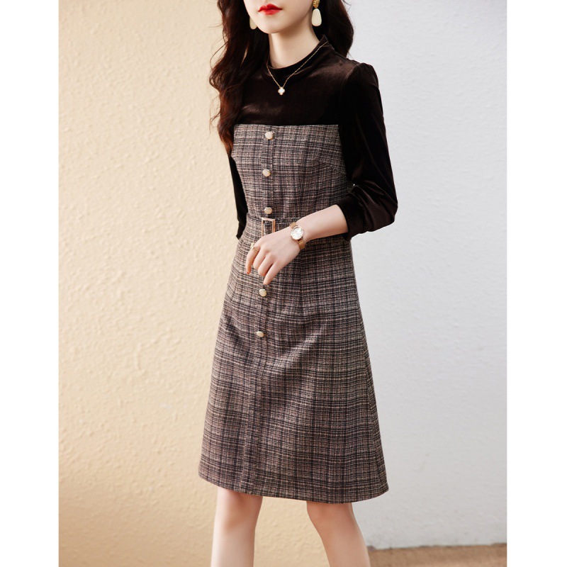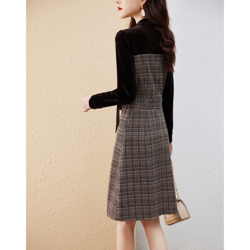 Главная страница > Весна Осень Зима Новый корейский стиль Модное городское элегантное универсальное элегантное бархатное платье в клетку в стиле пэчворк