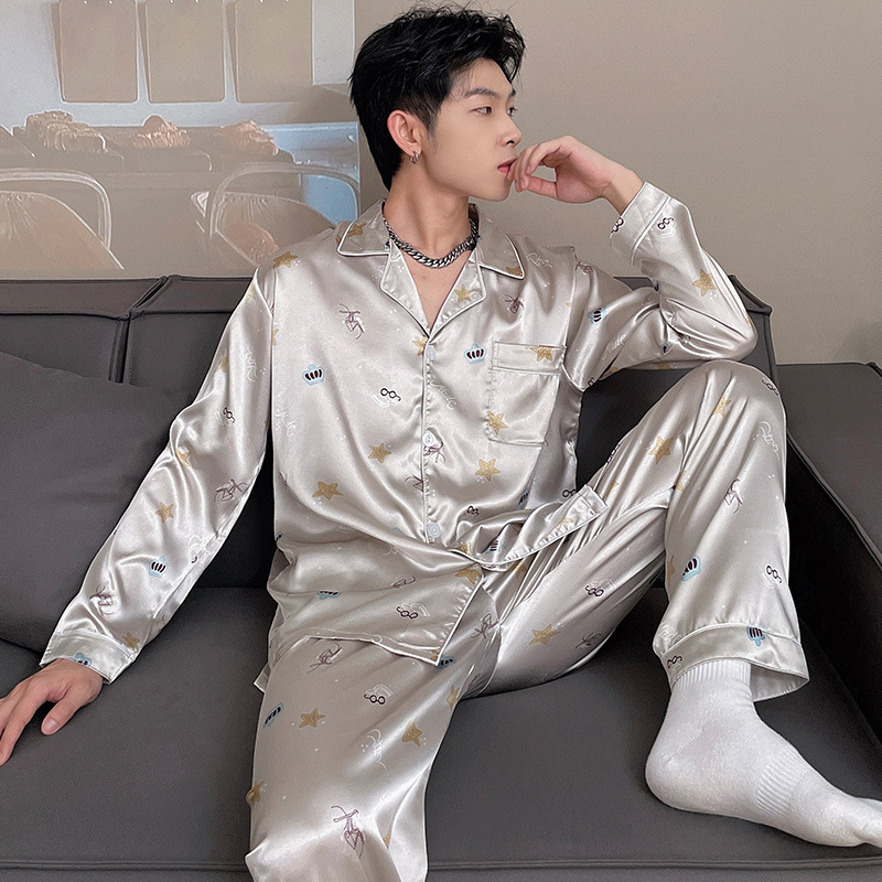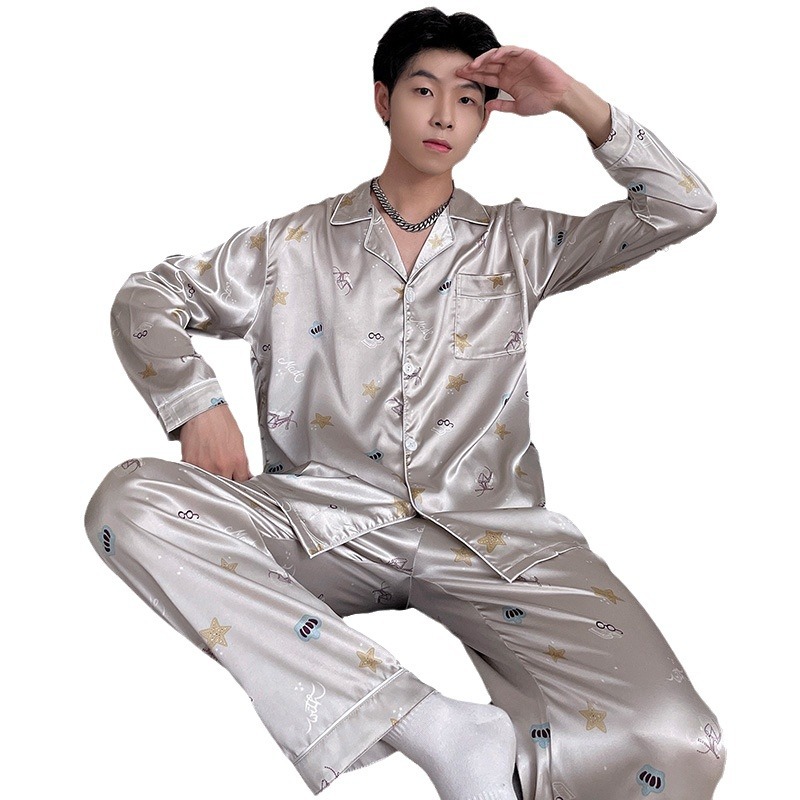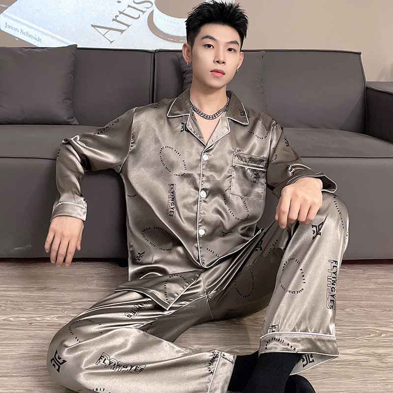 Главная страница > Пижама мужская весенняя и осенняя ледяная шелковая домашняя одежда с длинными рукавами Летняя тонкая ледяная шелковая свободная сумка из двух частей