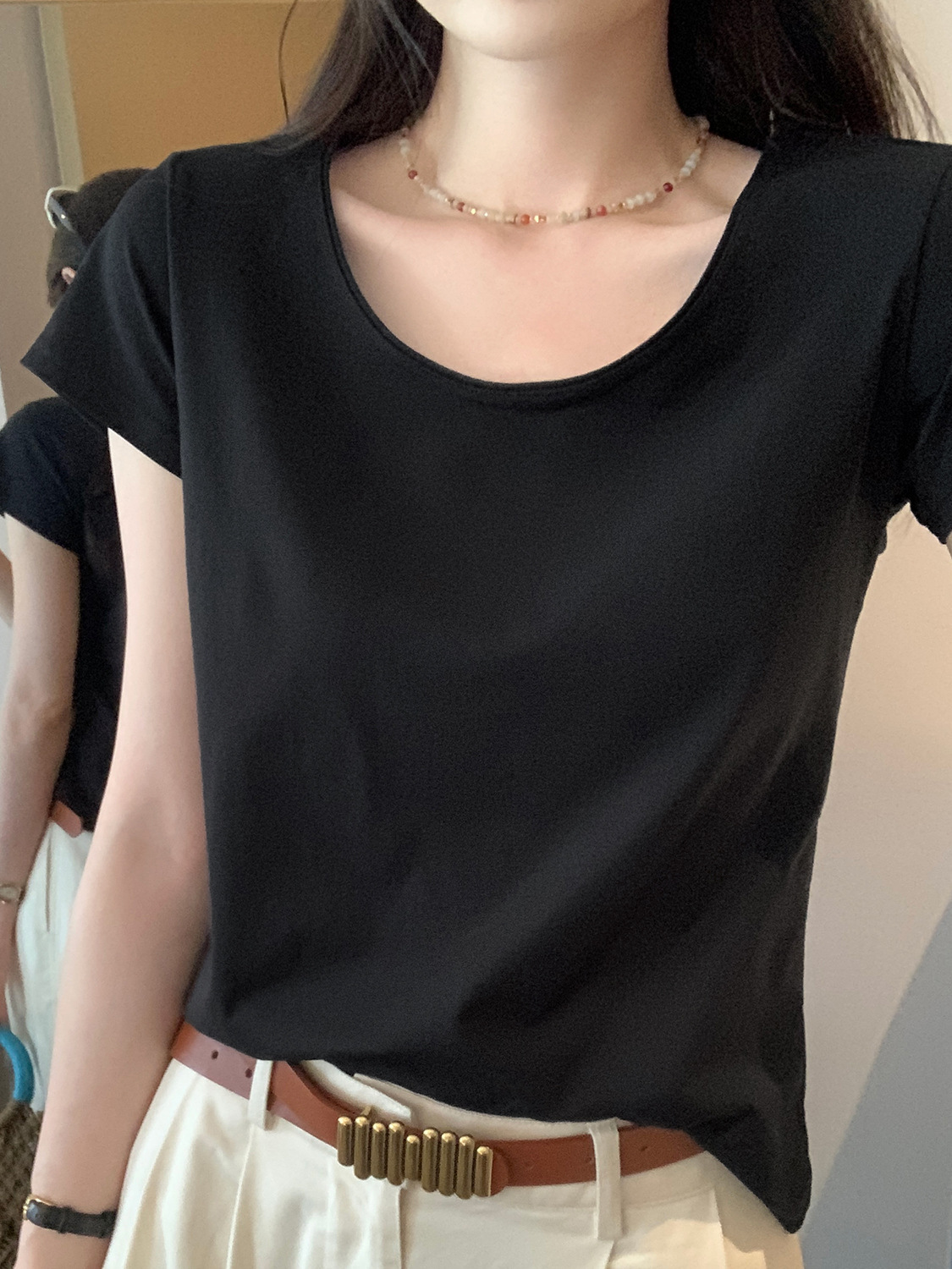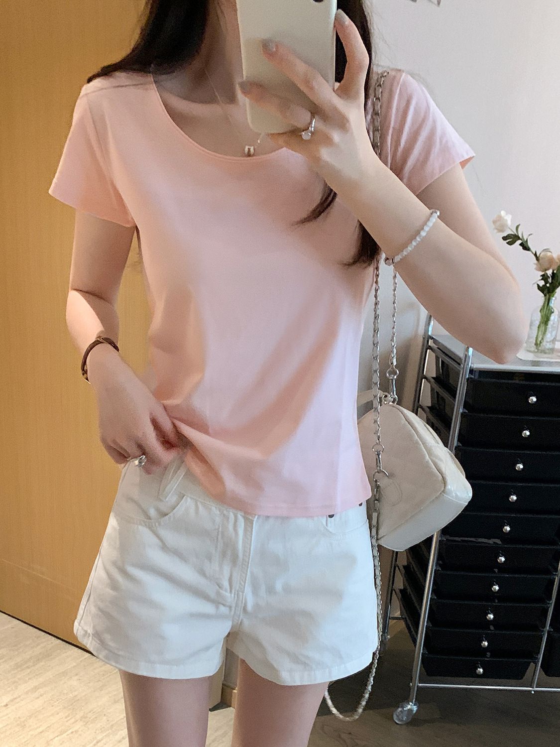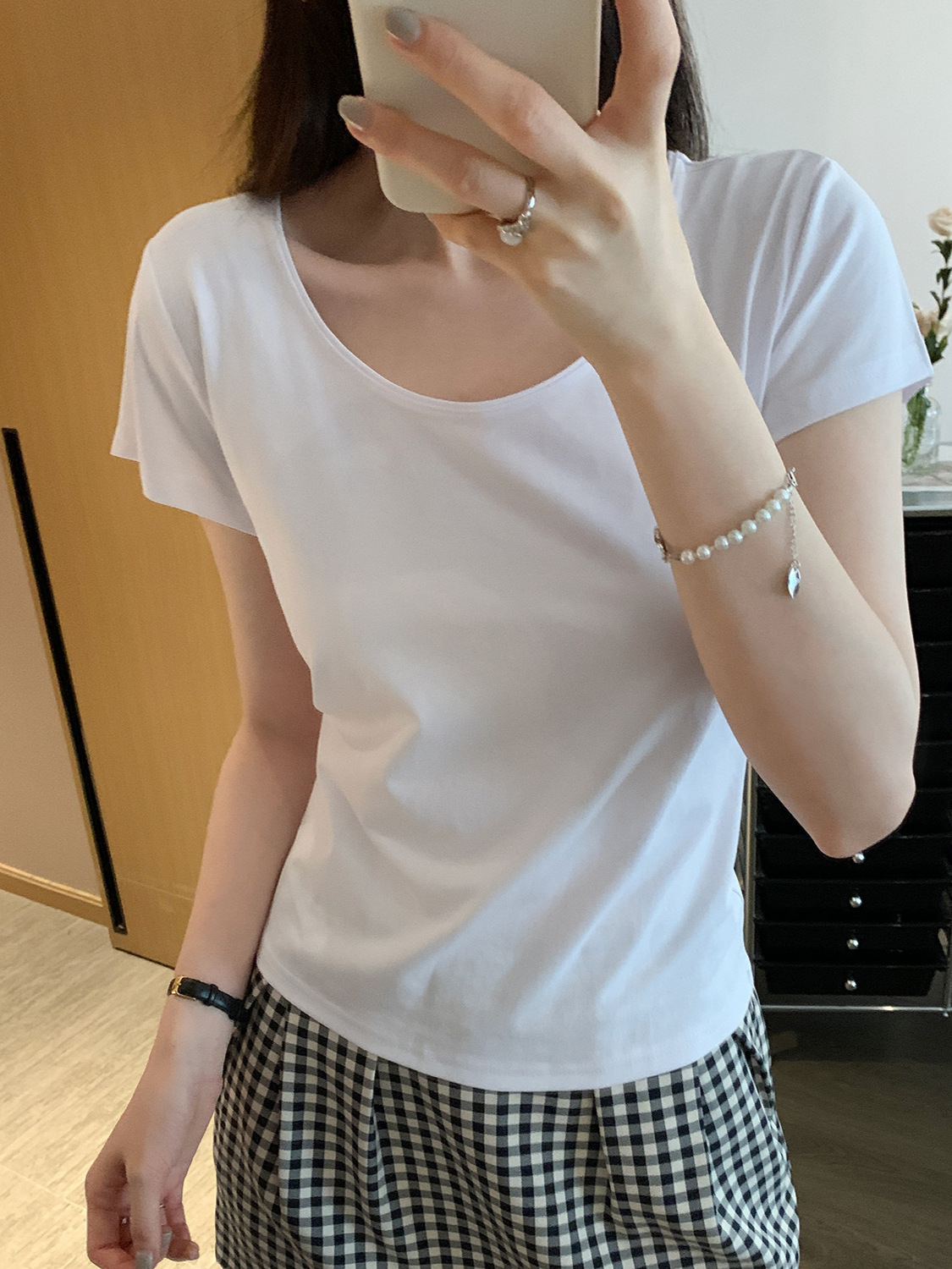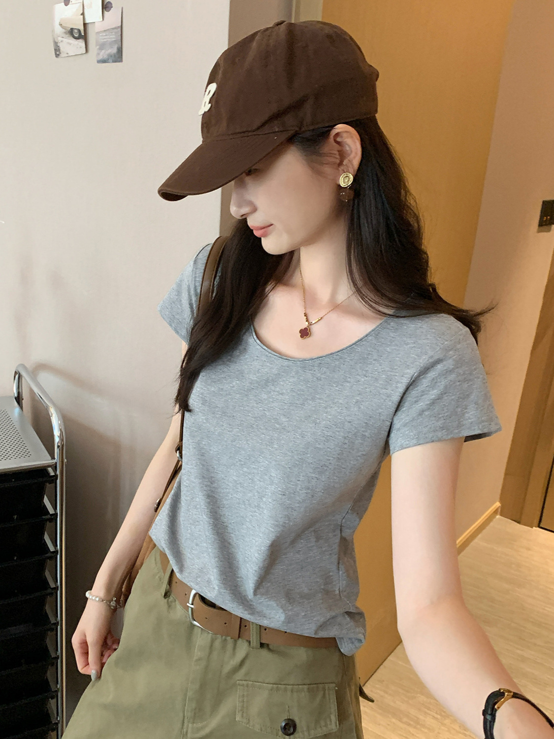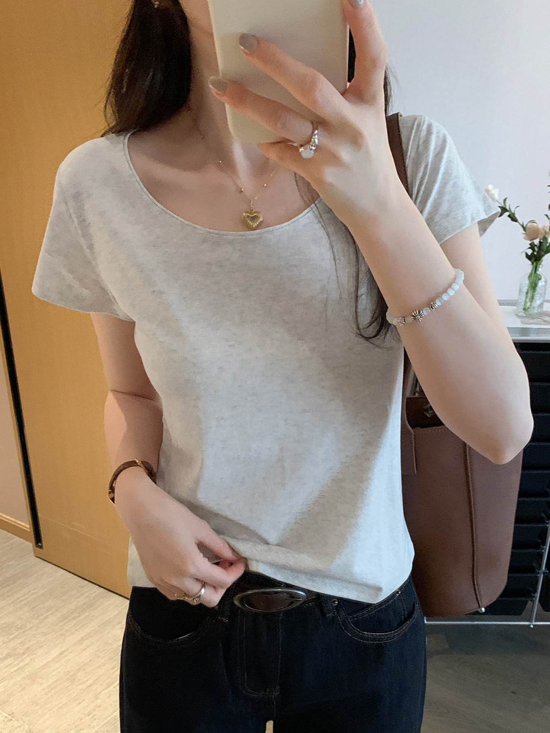 Главная страница > Белая футболка на правое плечо, женская летняя футболка с короткими рукавами, новый стиль, простой, стройнящий, элегантный, тонкий, серый, модный топ с U-образным вырезом и открытым ключицей