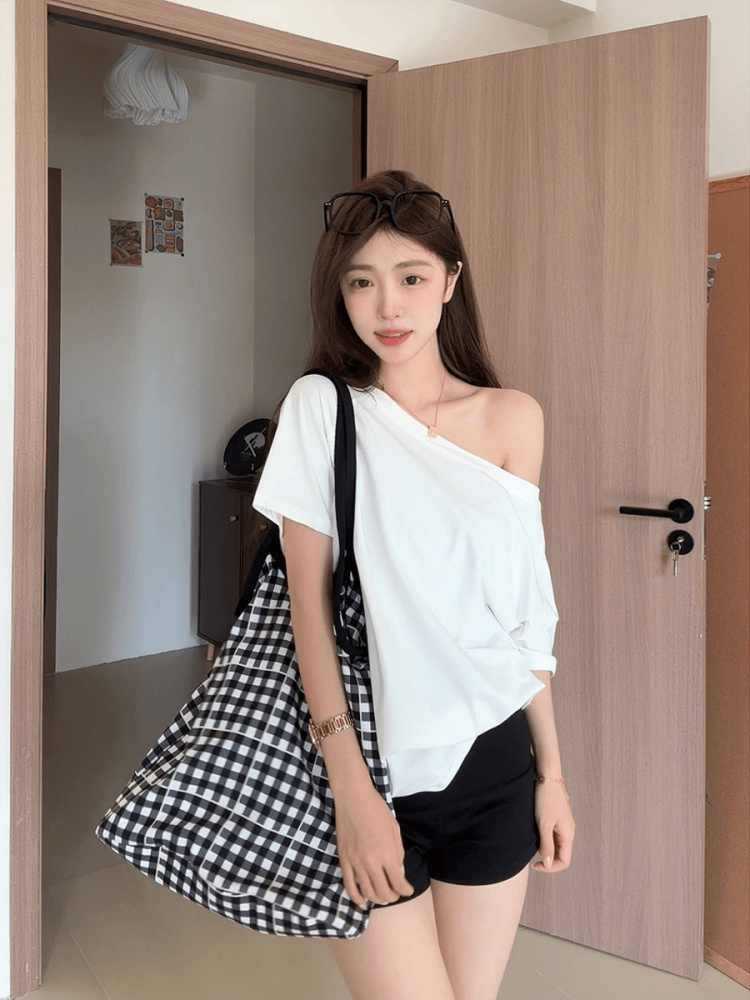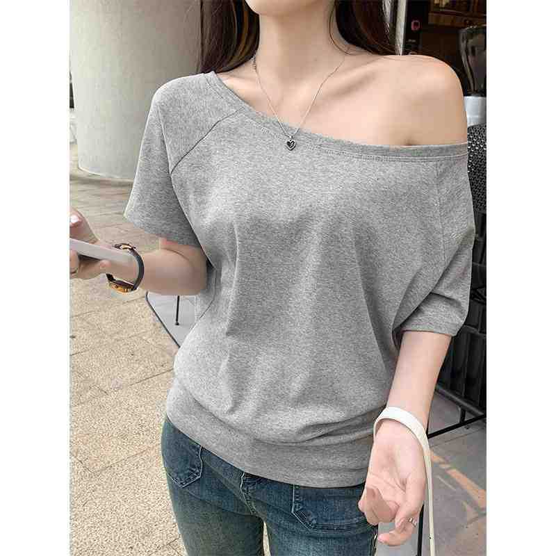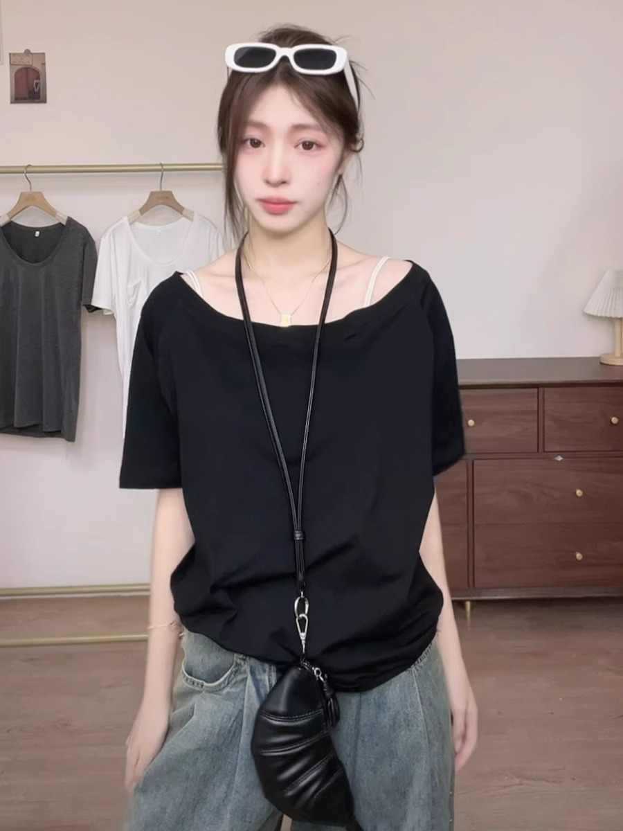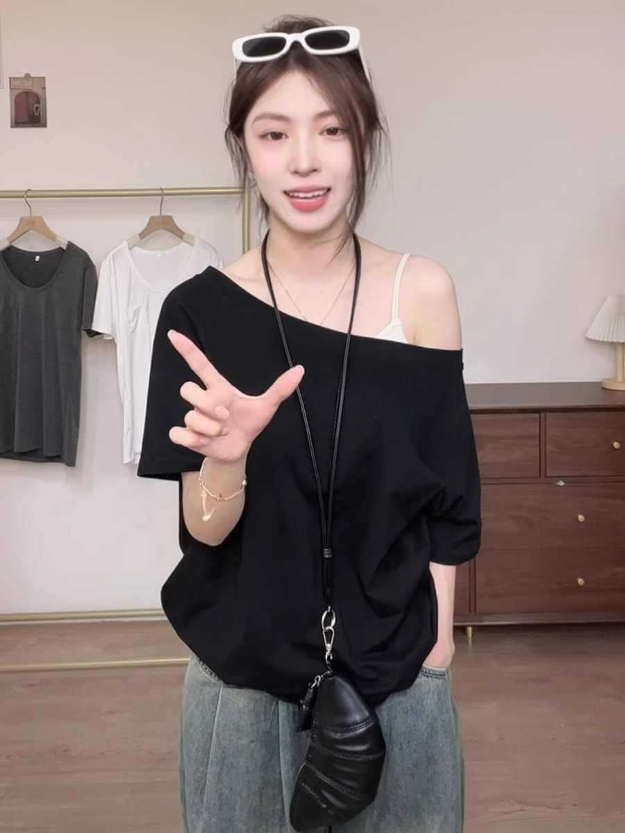 Главная страница > Белые косые плечи с открытыми плечами футболка женская короткая рукава Лето 2025 новая свободная тонкая крытая плоть