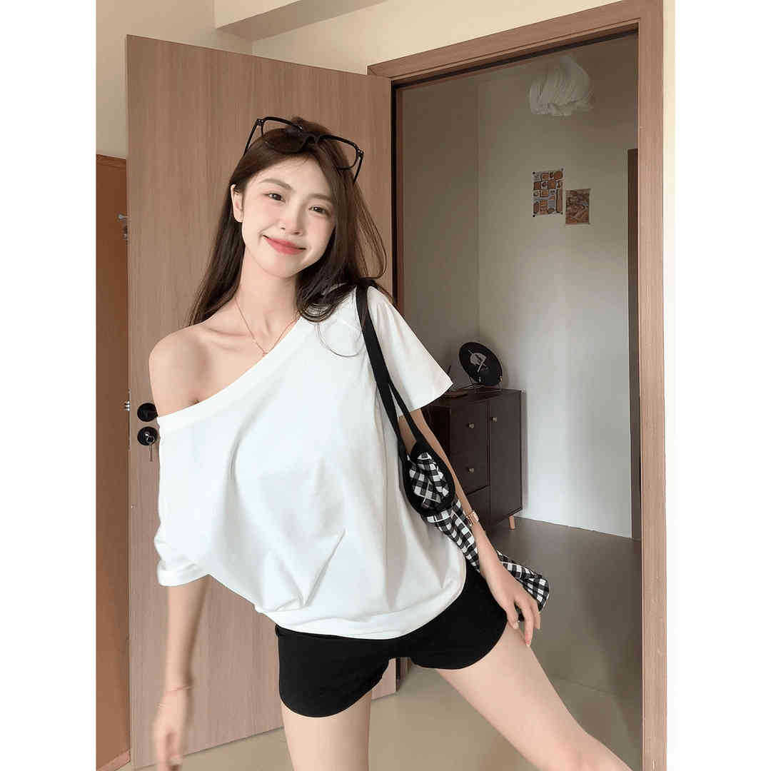 Белые косые плечи с открытыми плечами футболка женская короткая рукава Лето 2025 новая свободная тонкая крытая плоть