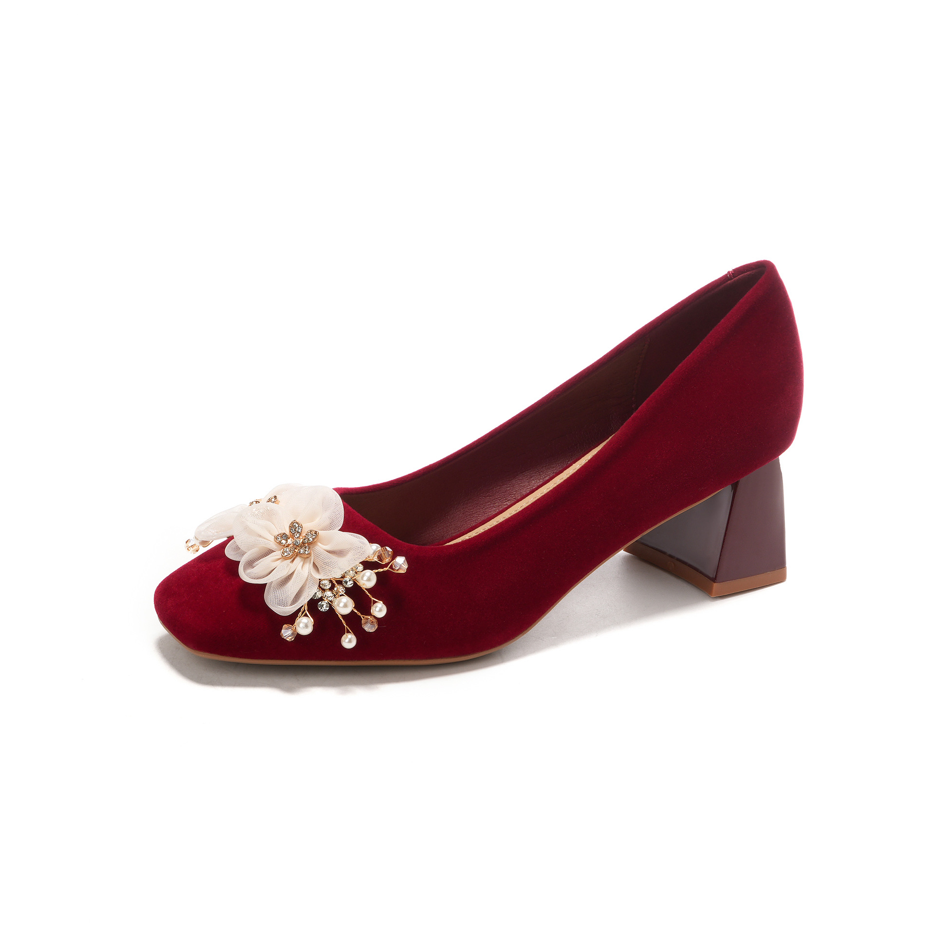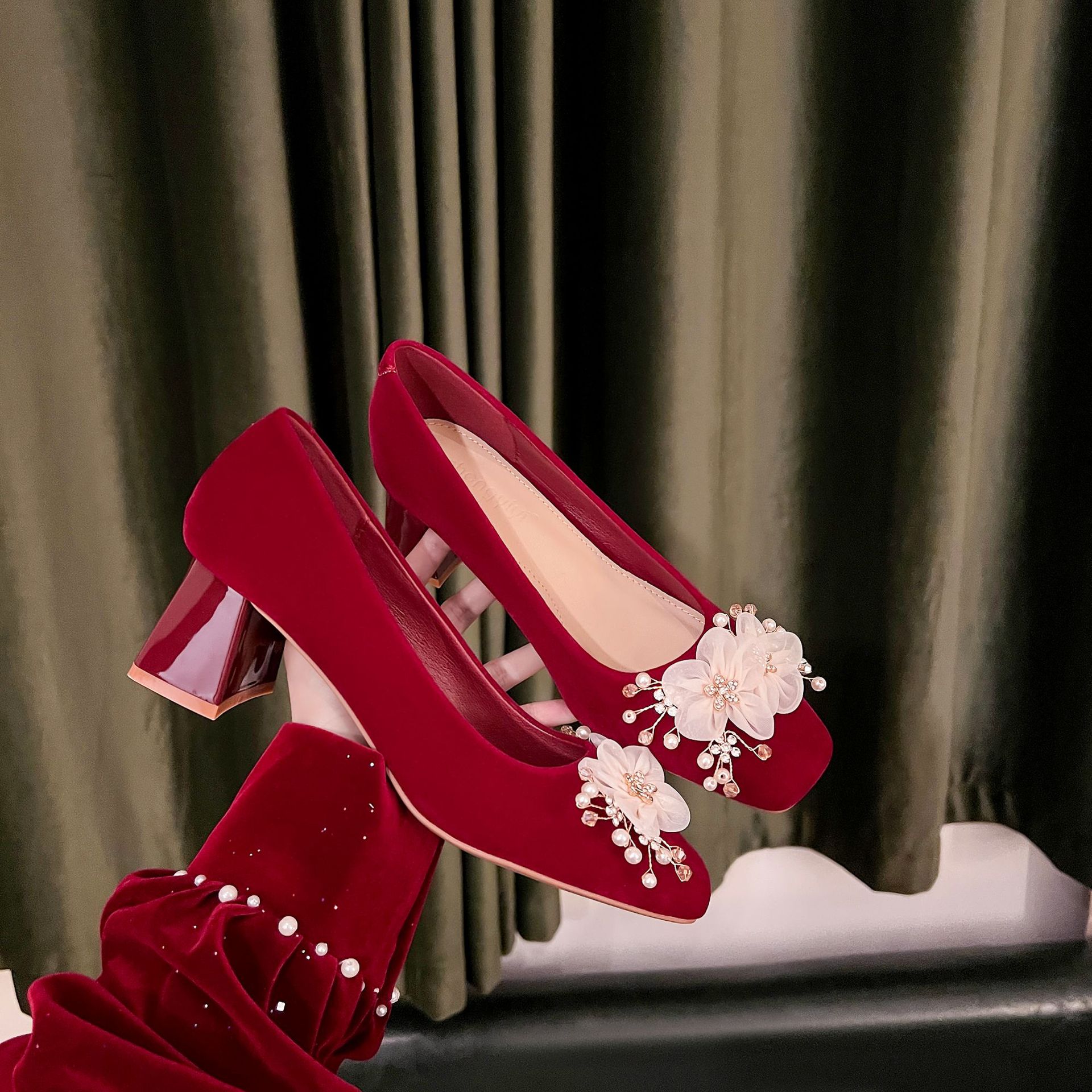 666-22 Новые Свадебные Туфли Невесты Бархат Красный Высокий Каблук Квадратная Голова Xiuhe Свадебное Платье Две Одежды Не Устали Ноги Обручальные Туфли