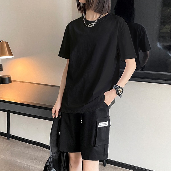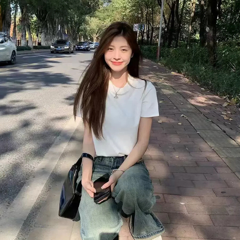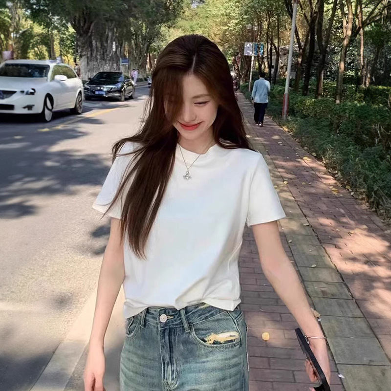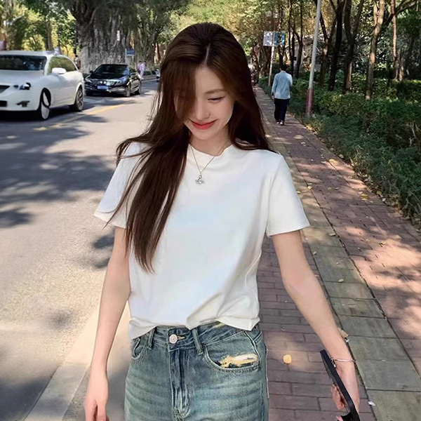 Главная страница > Сплошная футболка с короткими рукавами для женщин летом 2024 новый свободный тонкий плечо с короткими рукавами с внутренним круглым вырезом из дикого хлопка топ