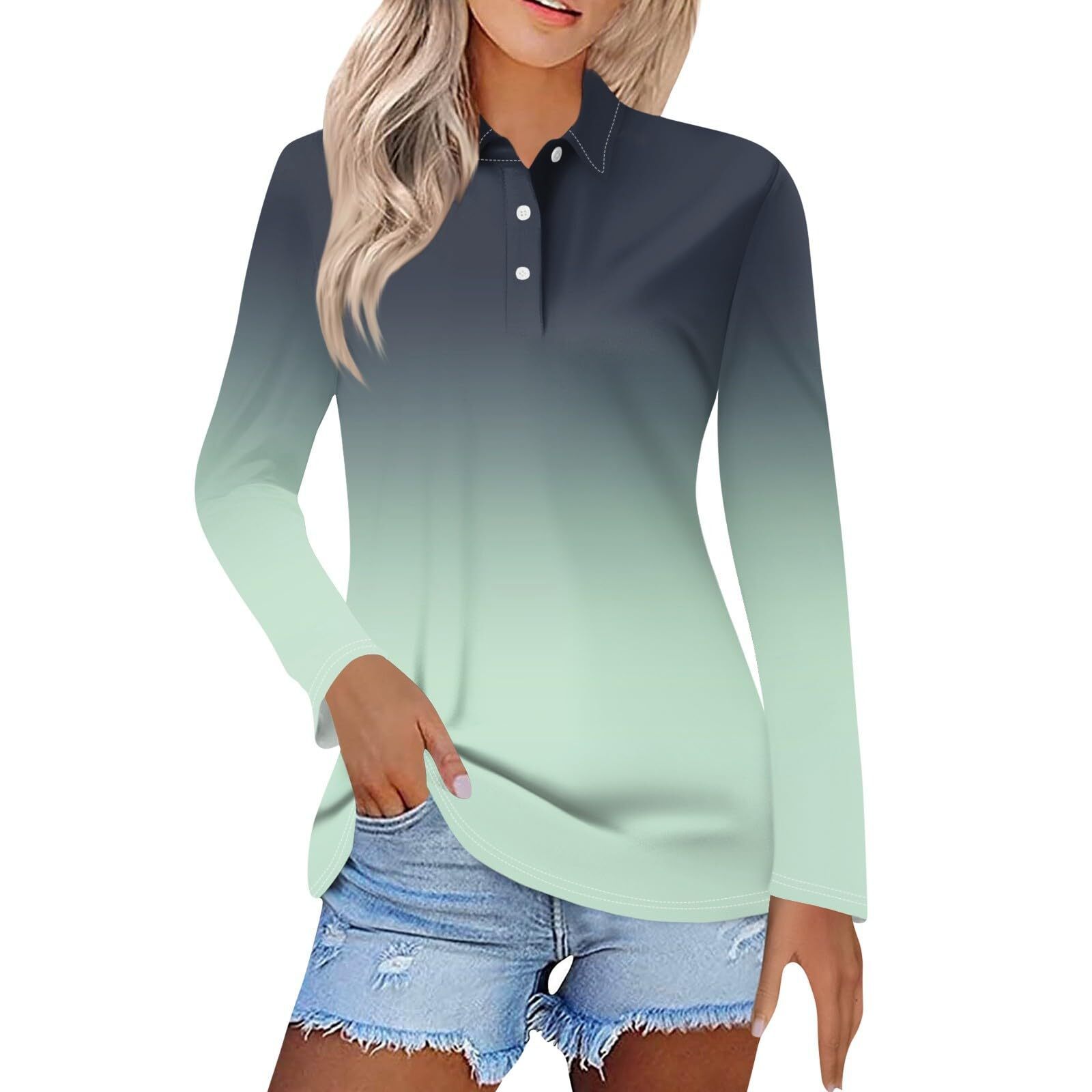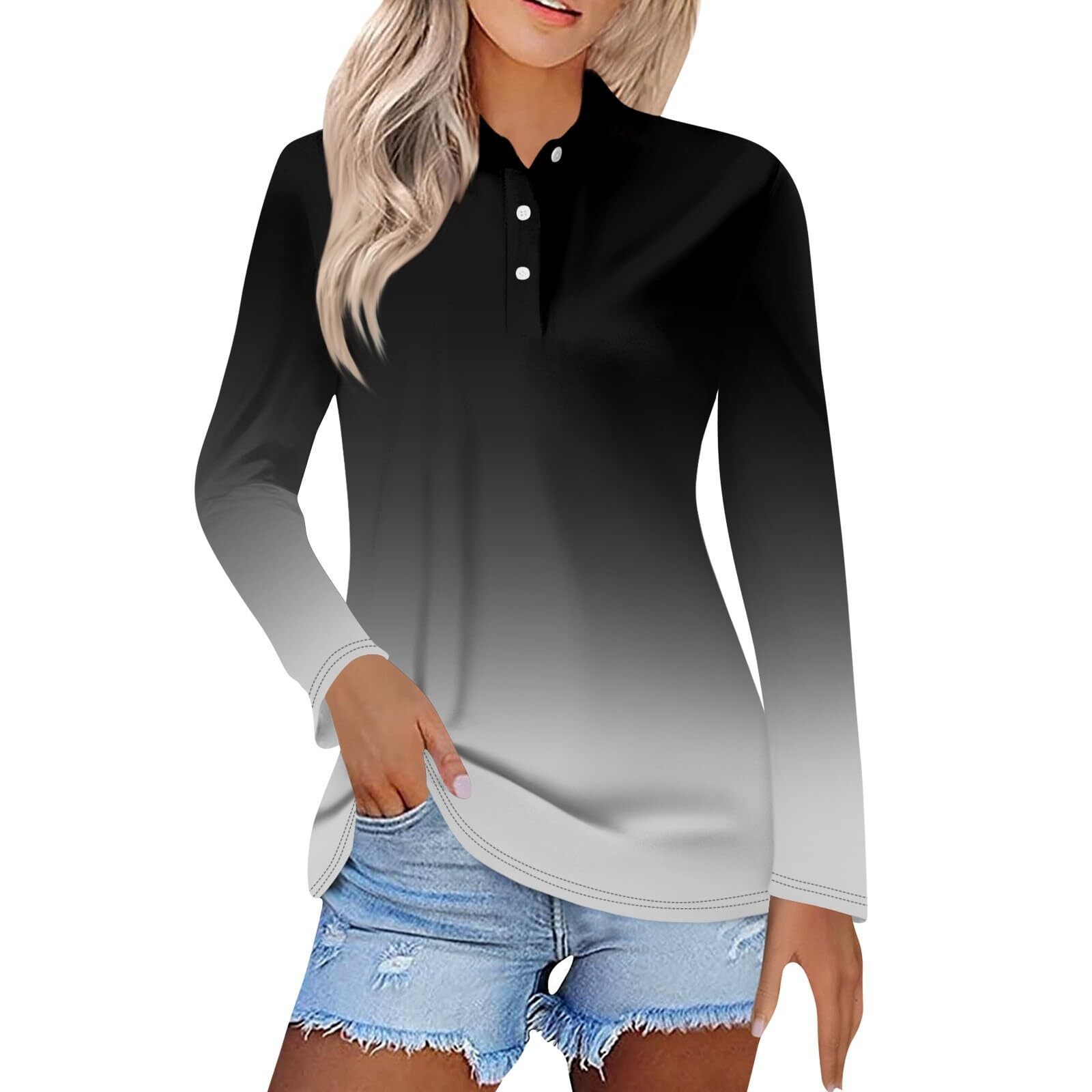 Женская весна и лето новый 2024 трансграничный градиент серии спотовая пуговица повседневная свободная футболка с длинными рукавами топ MB14