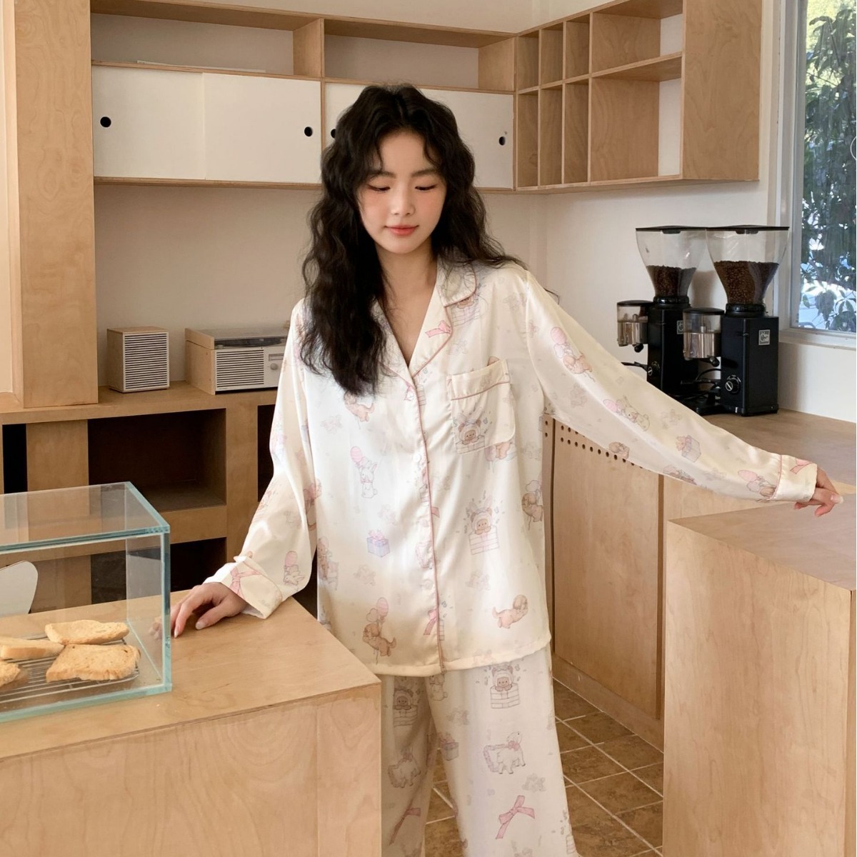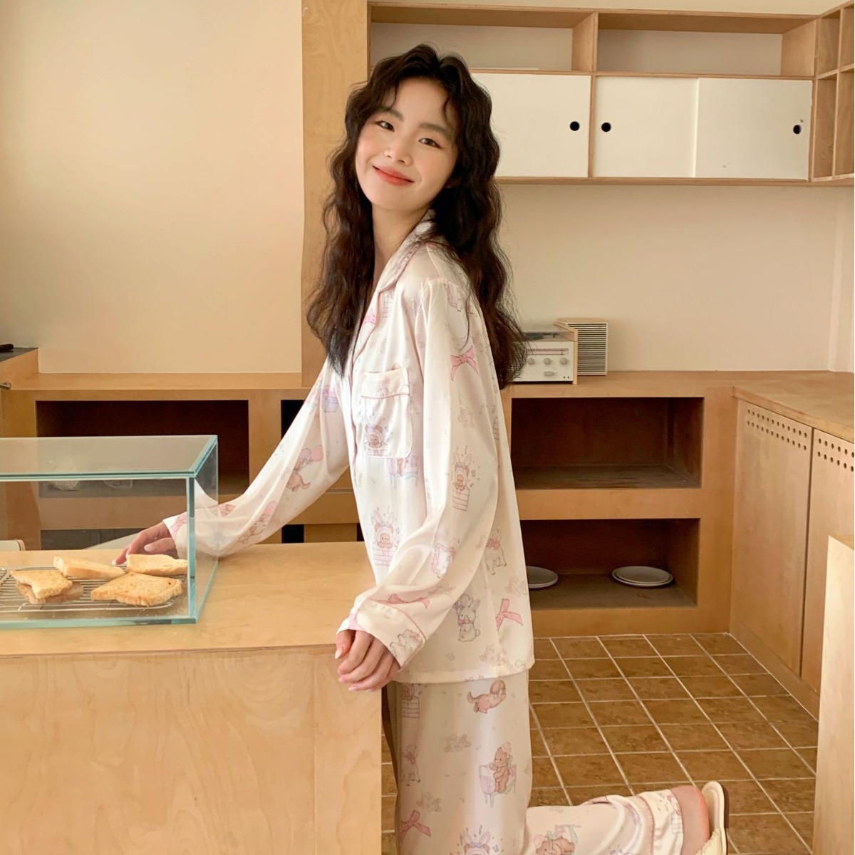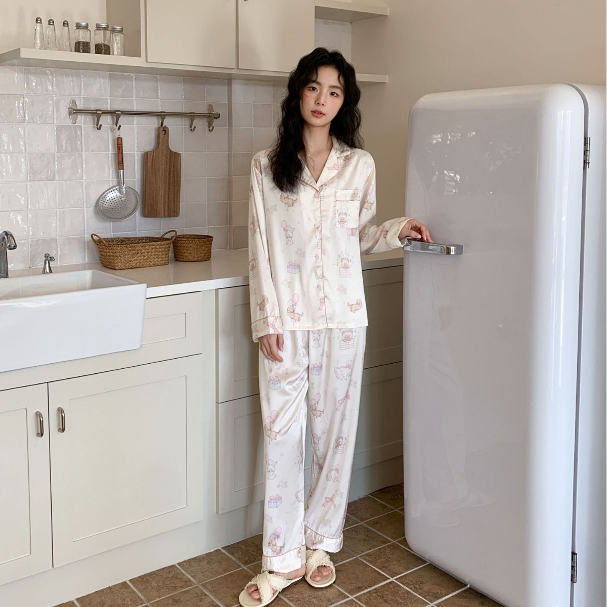 Главная страница > Розовый Медведь пижамы для девочек в Корейском стиле сладкий искусственный шелк Весна Новая Домашняя одежда лацкан Тонкий