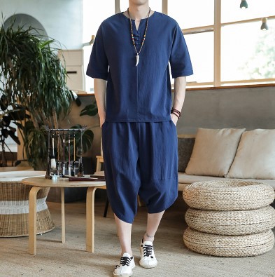 Главная страница > Повседневный костюм из хлопка и льна в китайском стиле в стиле ретро, повседневный мужской свободный модный летний костюм из двух предметов с короткими рукавами, мужской костюм династии Хань