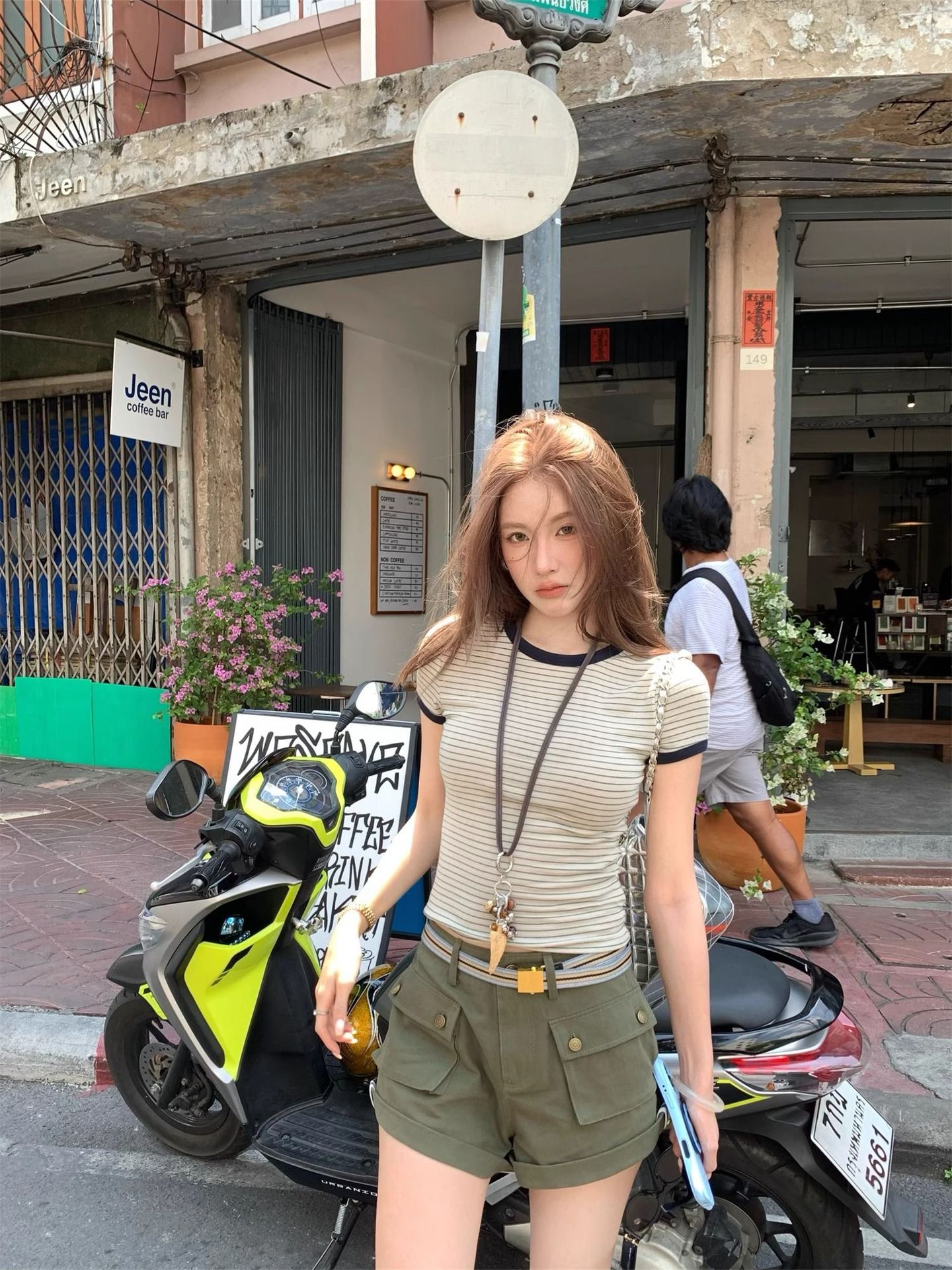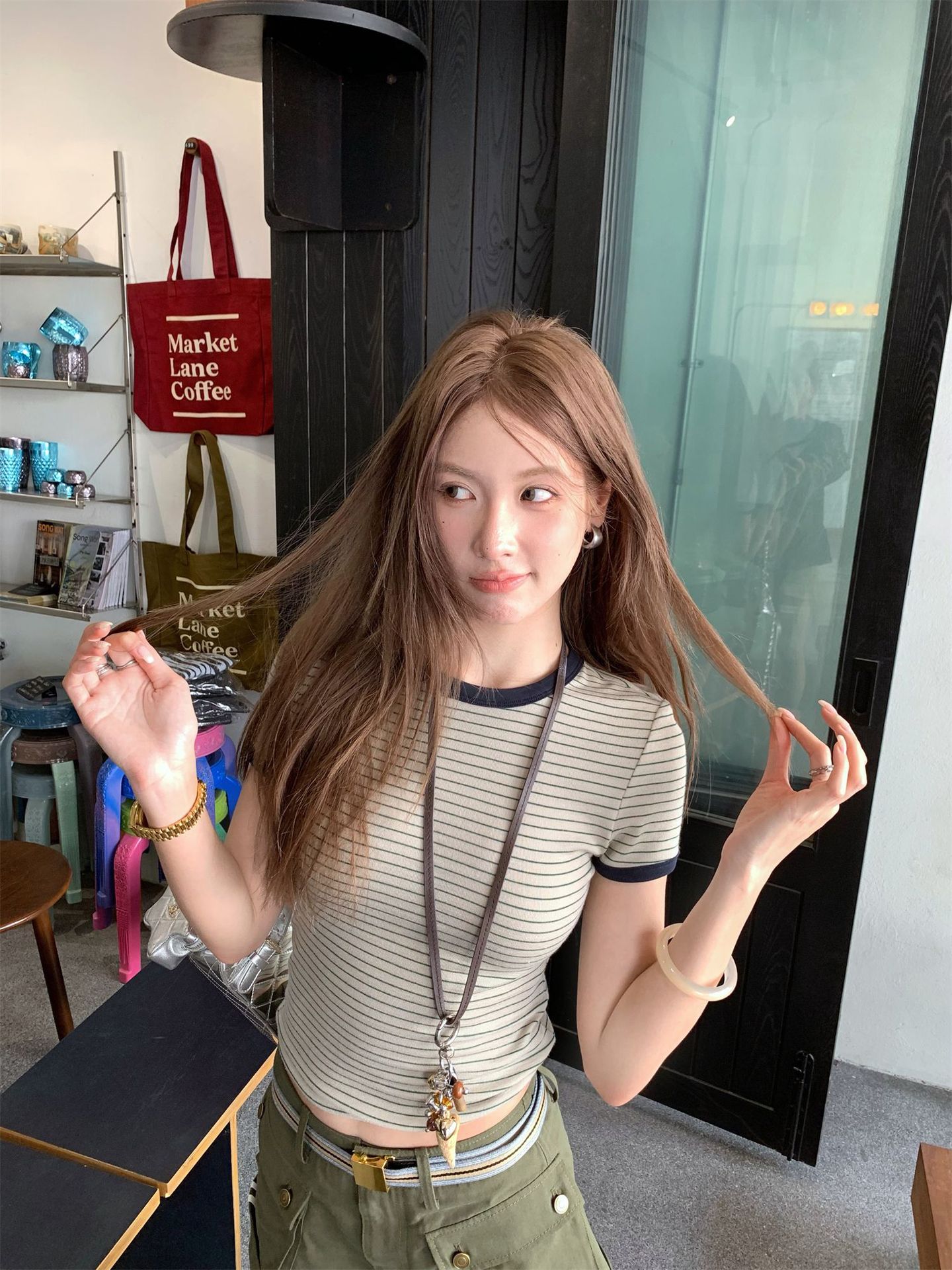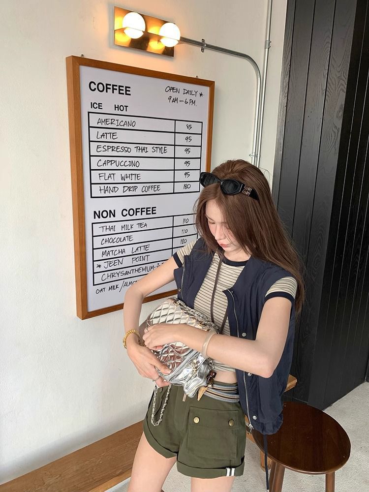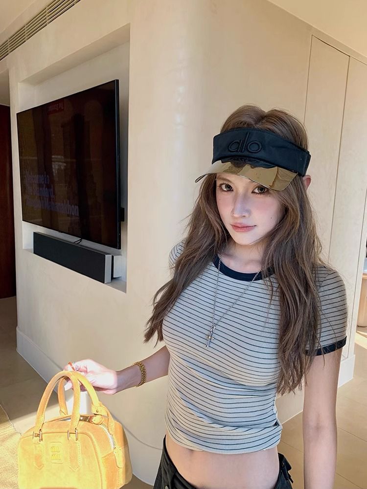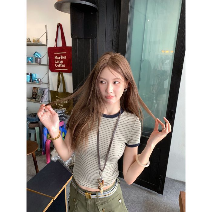 Главная страница > [Готовый заводской запас] Летняя дизайнерская футболка с контрастными горизонтальными полосками, женская футболка с короткими рукавами и круглым вырезом, топ для похудения на правое плечо и талию