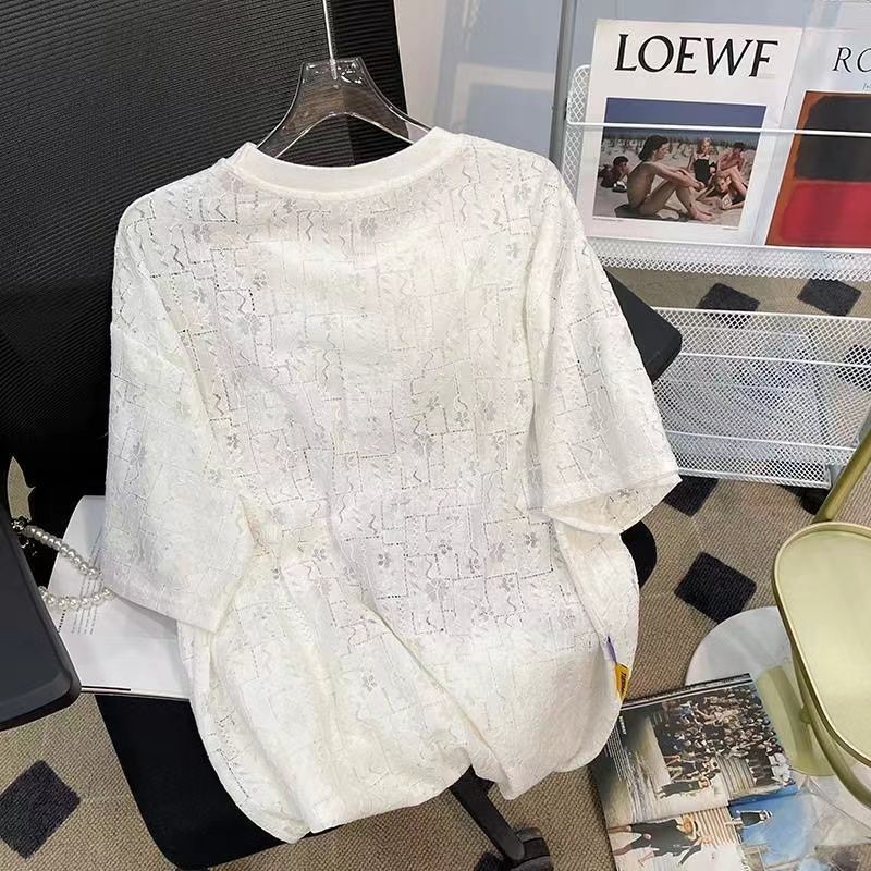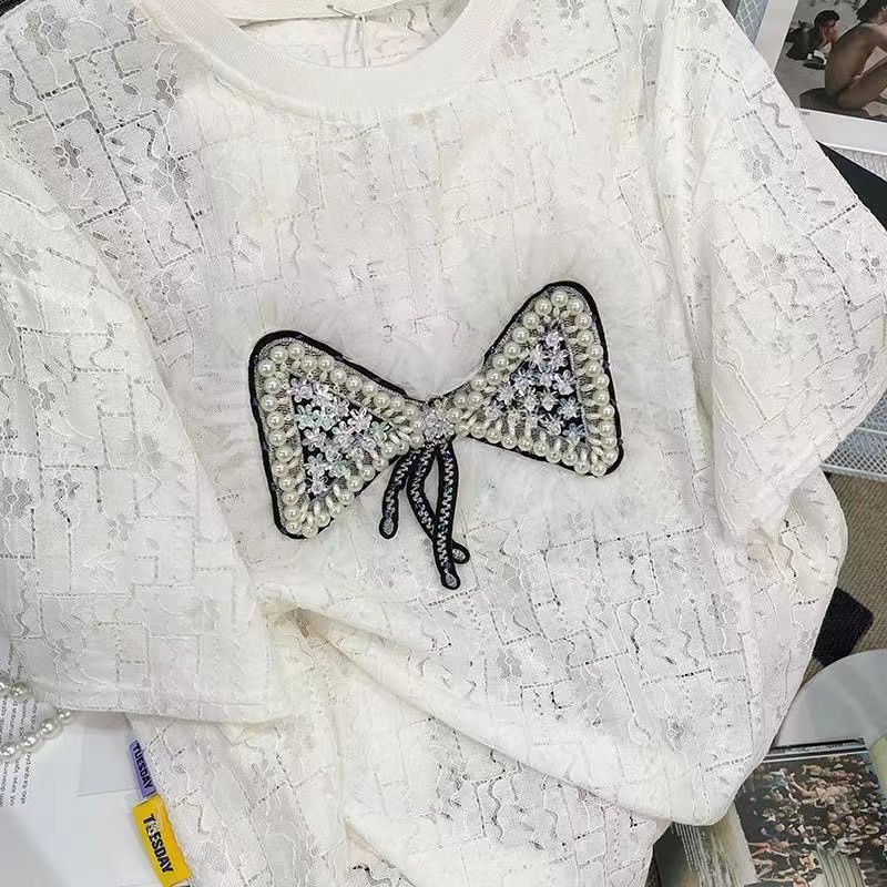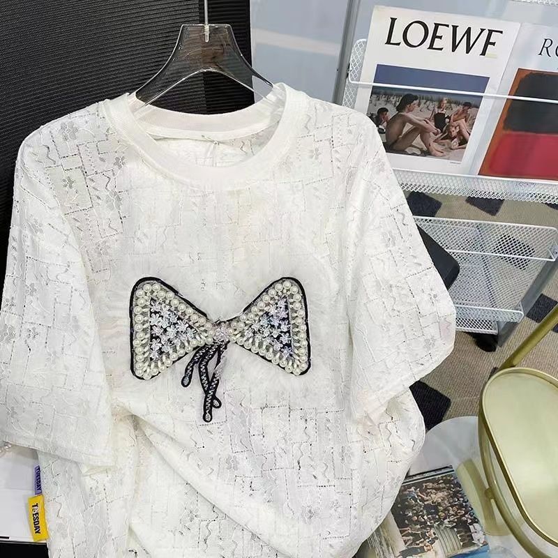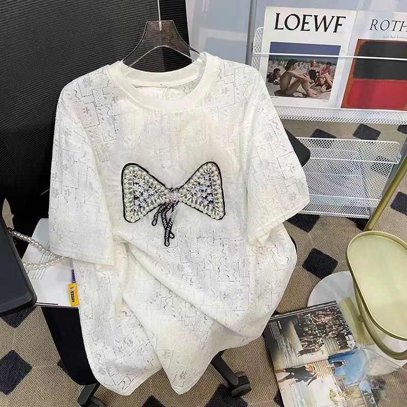Главная страница > 40-150kg лоскутная сетчатая кружевная футболка с бисером, женская футболка с короткими рукавами для полных девушек, плотно прилегающий топ средней длины, европейский модный тренд