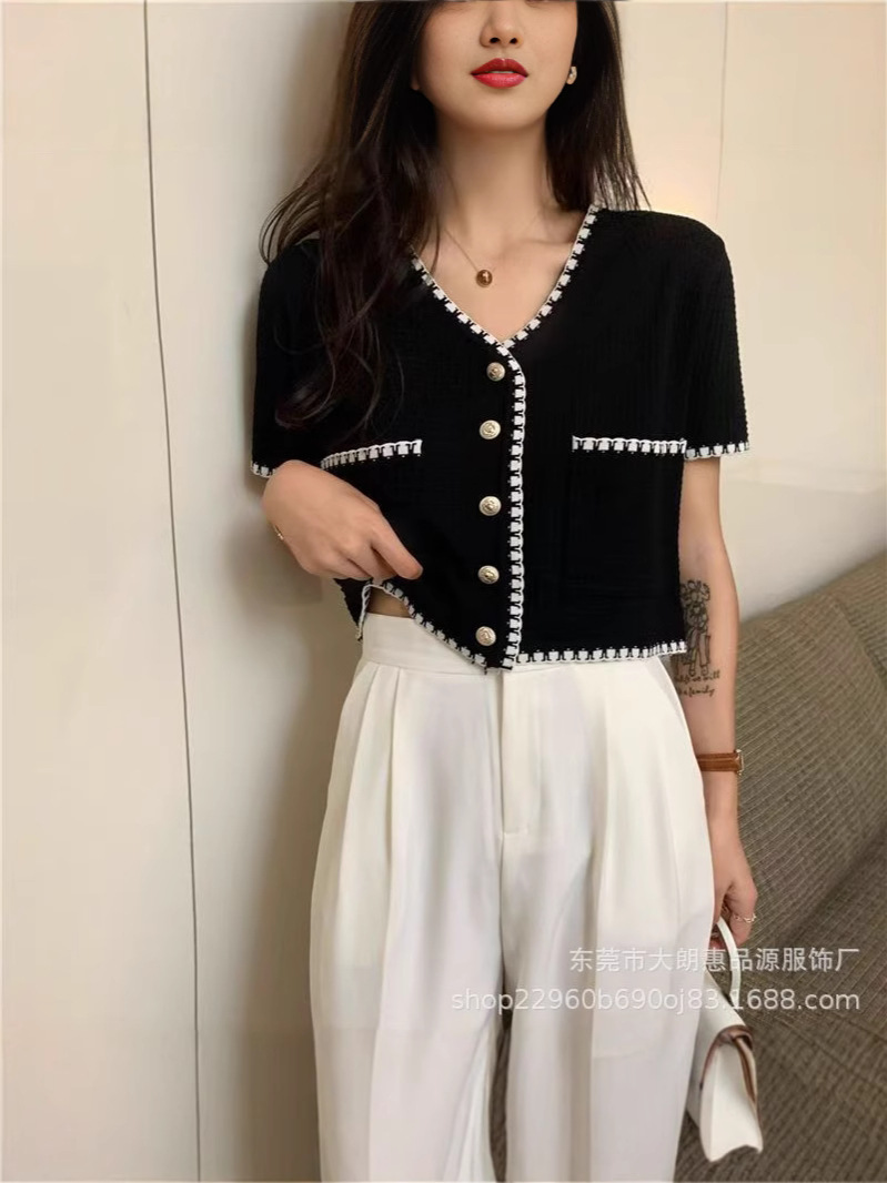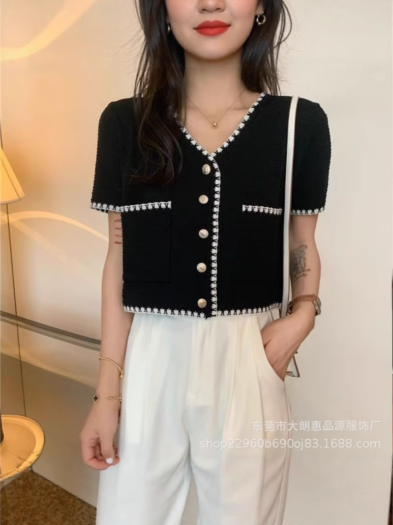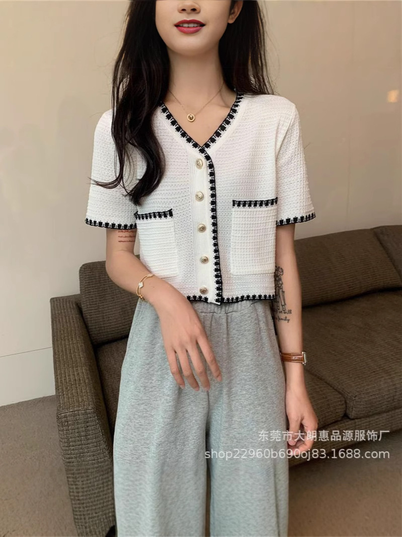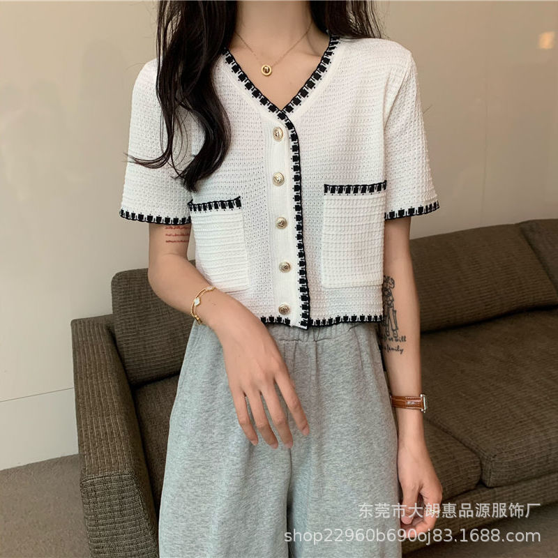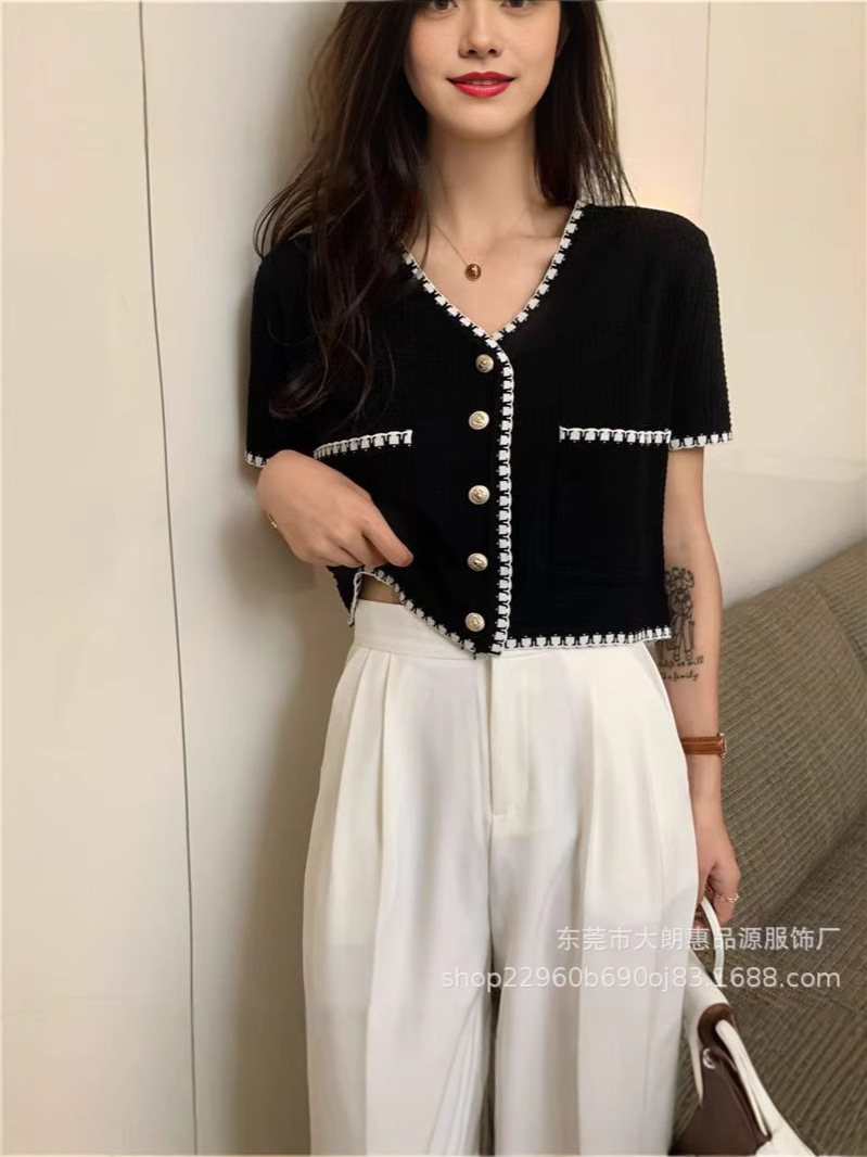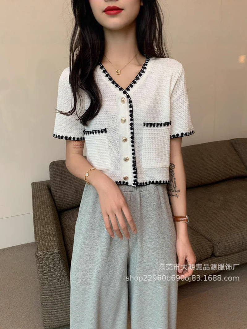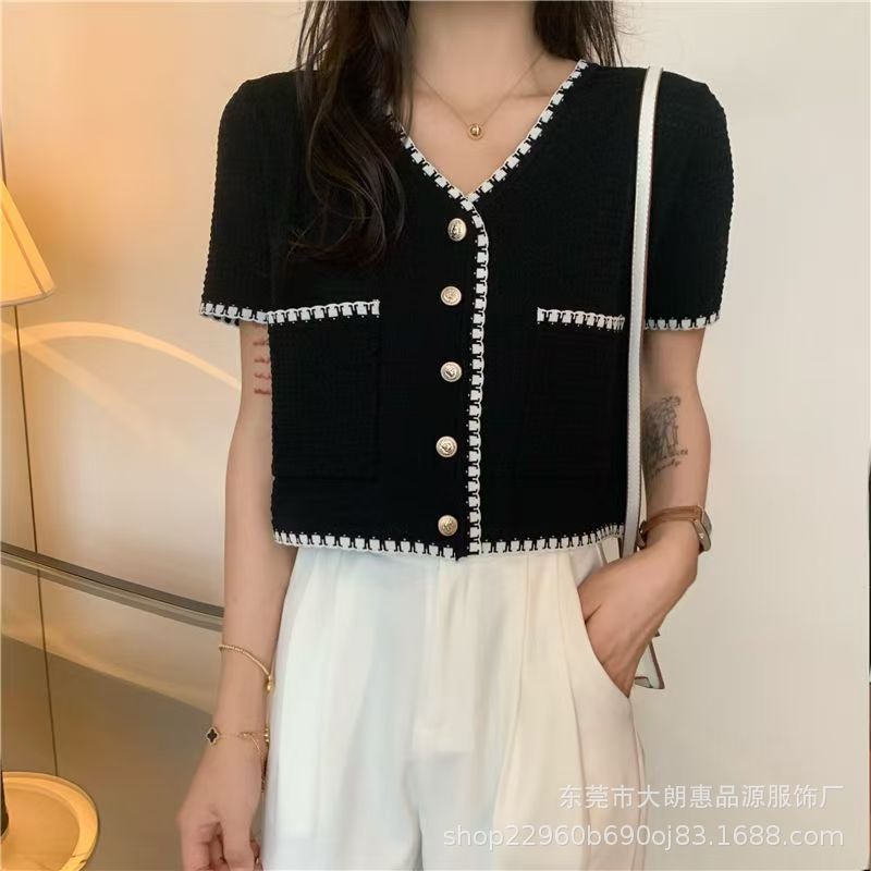 Главная страница > Летний кардиган 2025 года, новый стиль, элегантный, небольшой аромат, V-образный вырез, кружевной, универсальный, короткий, тонкий, с короткими рукавами, трикотажный, женский.