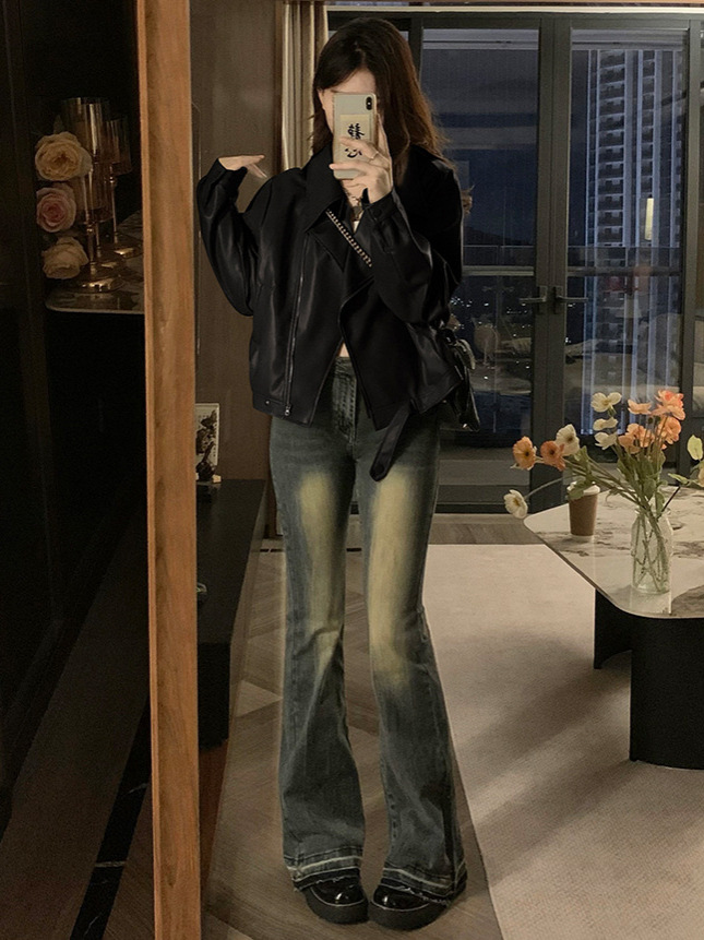 Главная страница > Американский ретро-карри цвета PU кожаная куртка для женщин 2024 раннего осеннего автомобиля куртка короткий топ