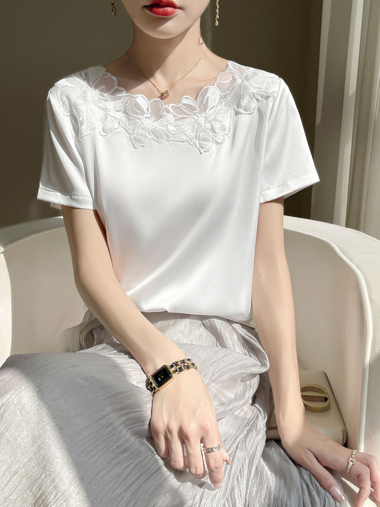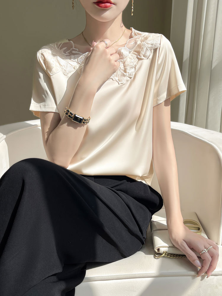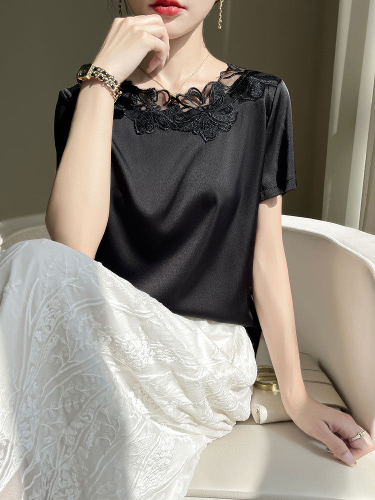 Главная страница > Производитель оптом шелковая атласная кружевная футболка с круглым вырезом и коротким рукавом, летняя женская майка 2024 года