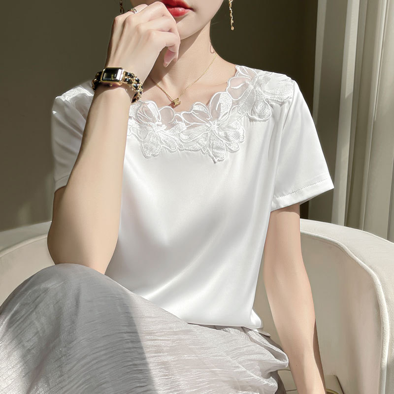 Производитель оптом шелковая атласная кружевная футболка с круглым вырезом и коротким рукавом, летняя женская майка 2024 года