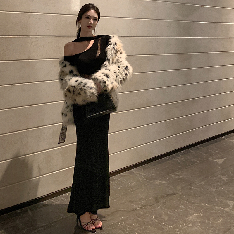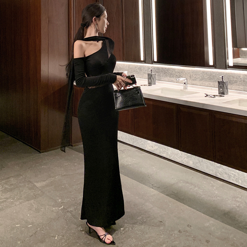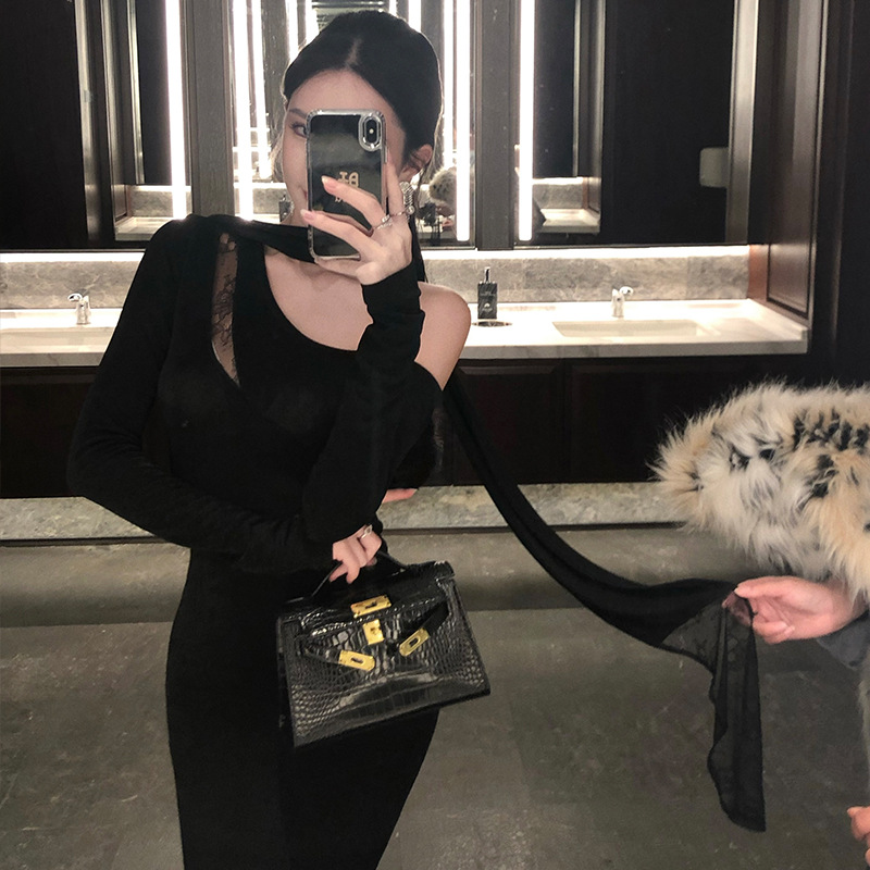 Главная страница > Кружевное сшивание Сексуальное чистое желание носить черное косая плечо осеннее зимнее платье женский день рождения платье темперамент тонкое платье