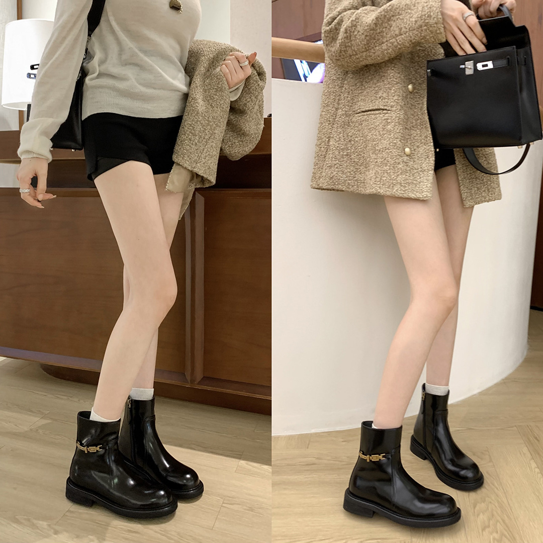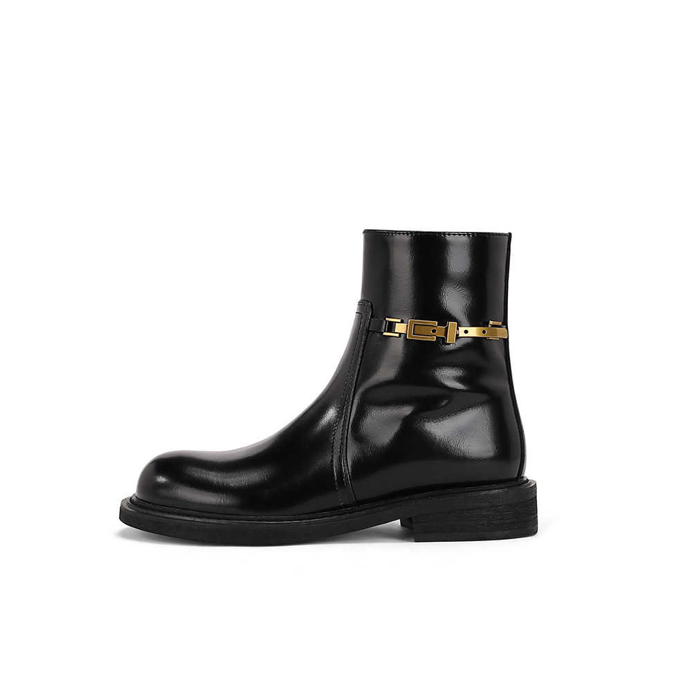 Главная страница > 【Стиль Grape Mom】Элегантные ботинки~ Короткие мотоциклетные ботинки из натуральной кожи с боковой молнией, маленькой золотой пряжкой и цепочкой, для женщин, облегающие