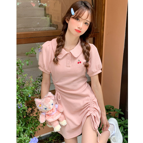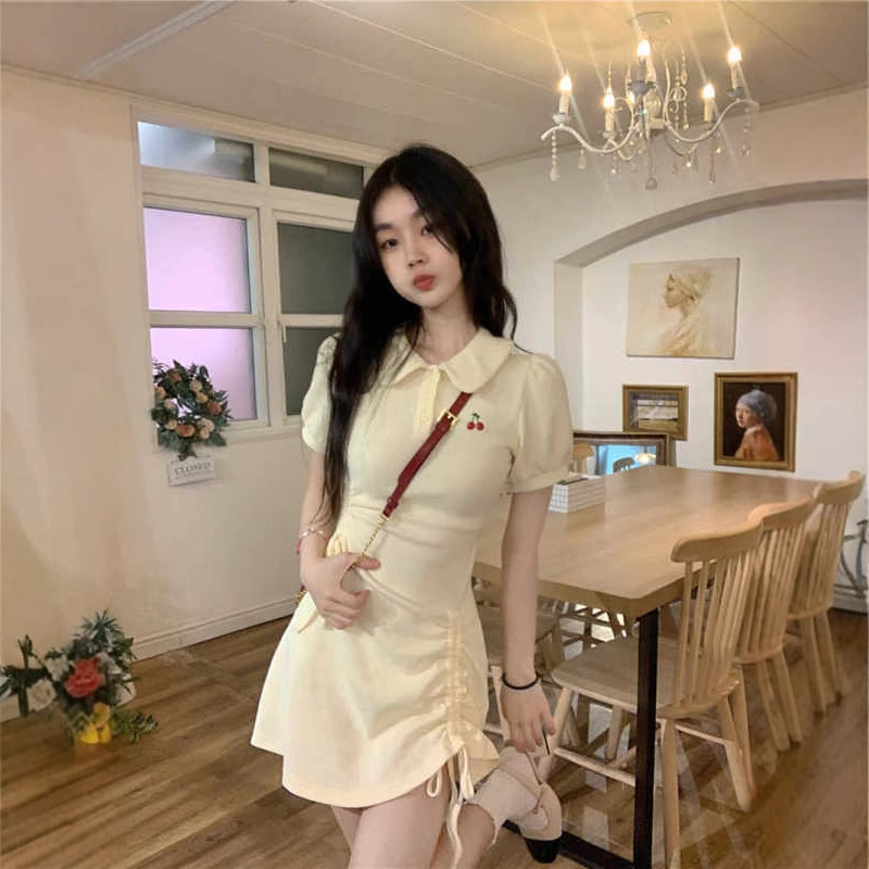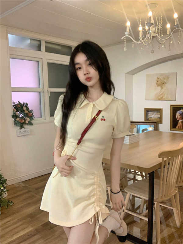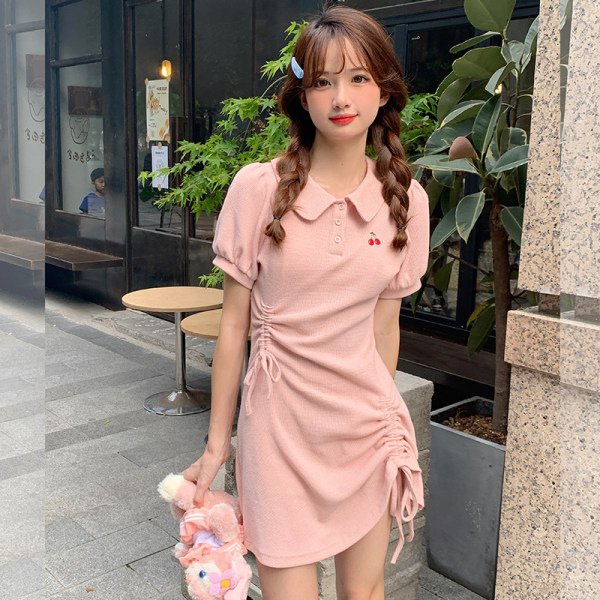 Главная страница > Платье с короткими рукавами и воротником-поло для уменьшения возраста, женская летняя юбка-трапеция с талией, короткая юбка на шнурке, в студенческом стиле