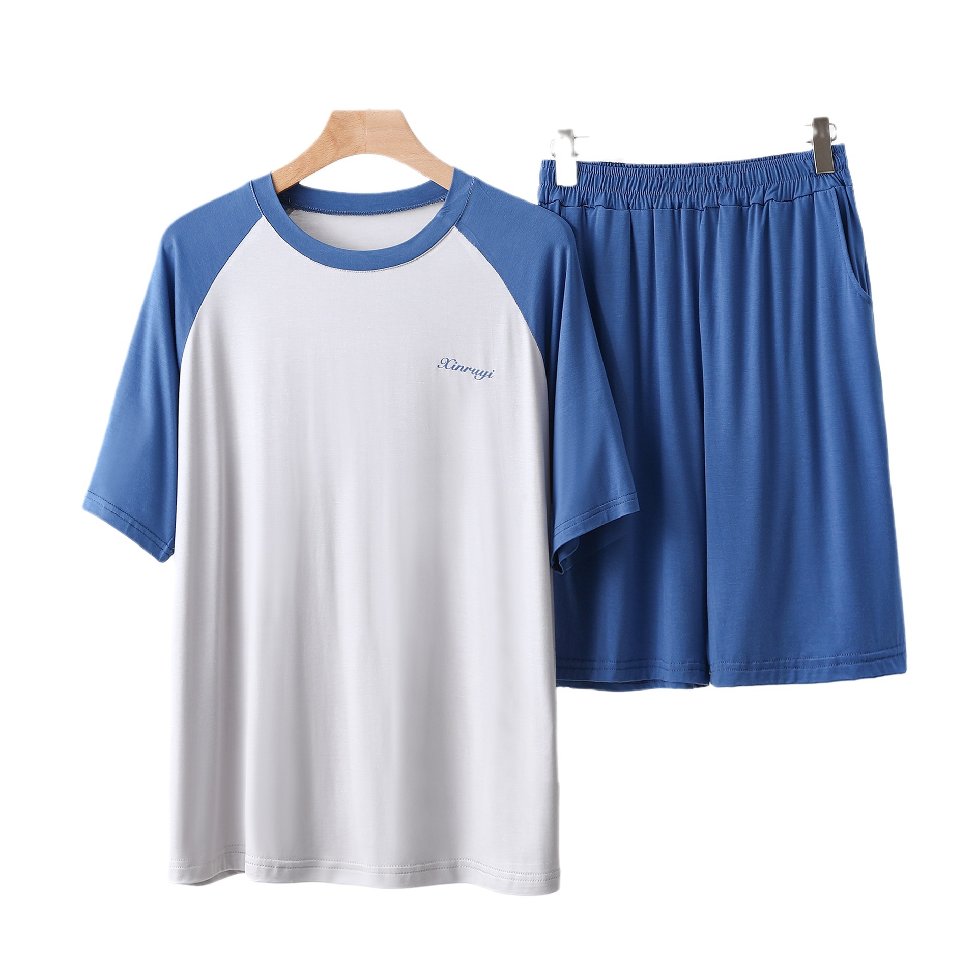 Летние тонкие шорты с коротким рукавом и принтом, мужские Модальные шорты с рукавом реглан, цветными блоками, домашняя одежда, Пижамный костюм больших размеров