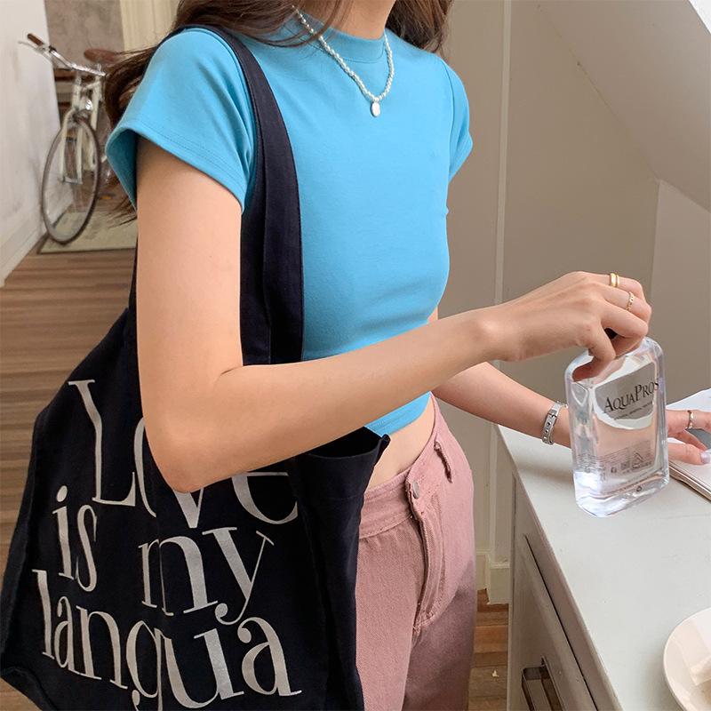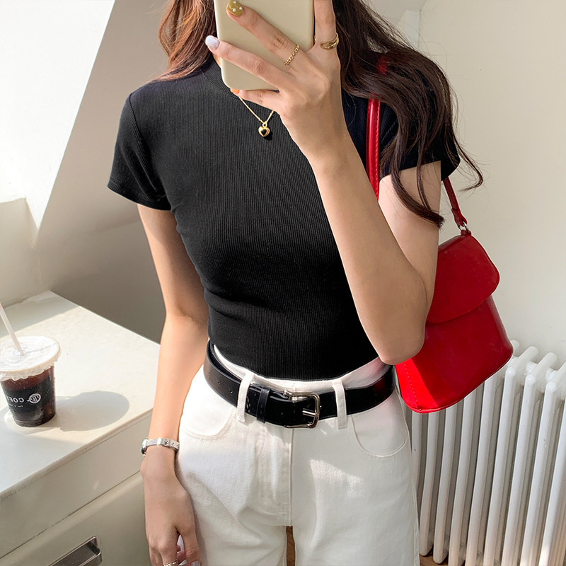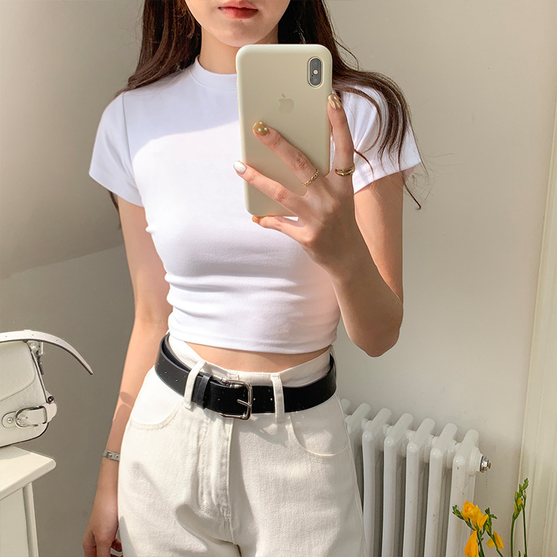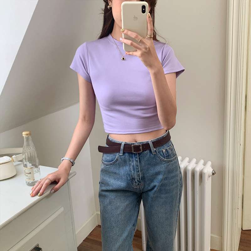 Главная страница > Футболка с круглым вырезом с положительным плечом женская короткая рукава Лето 2024 новая тонкая тонкая надета с высокой талией и коротким нижним топом