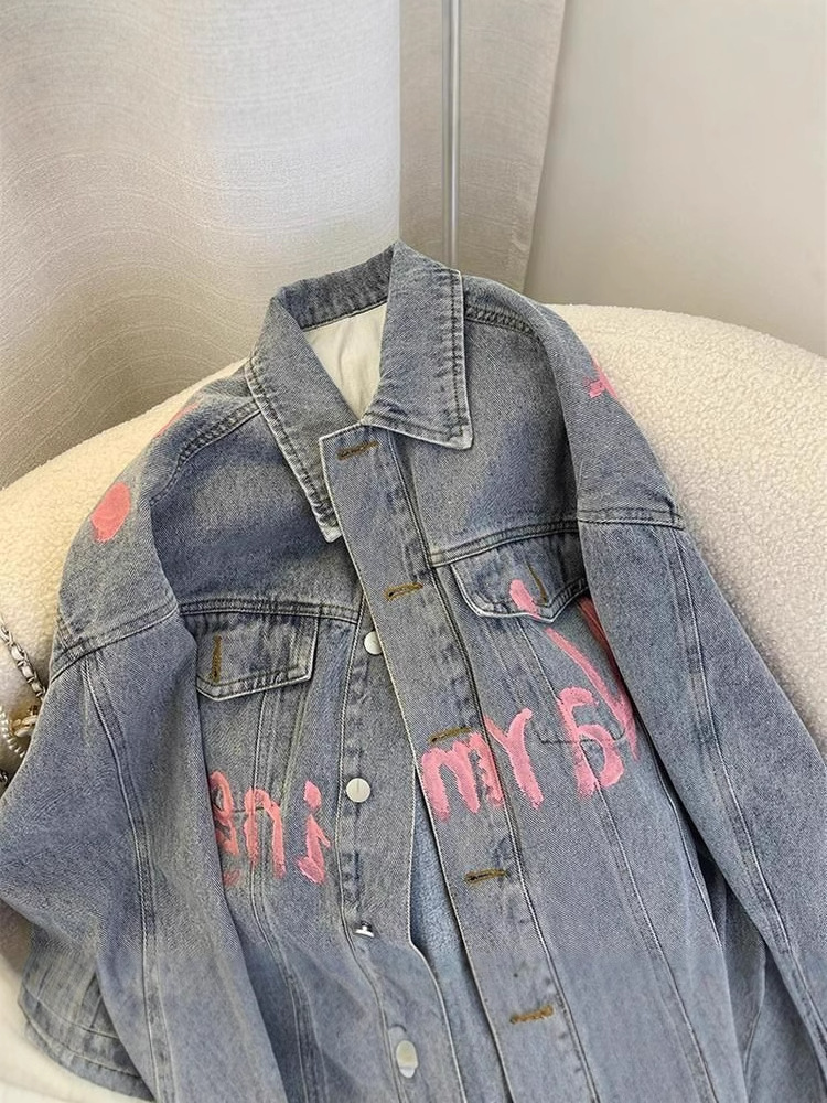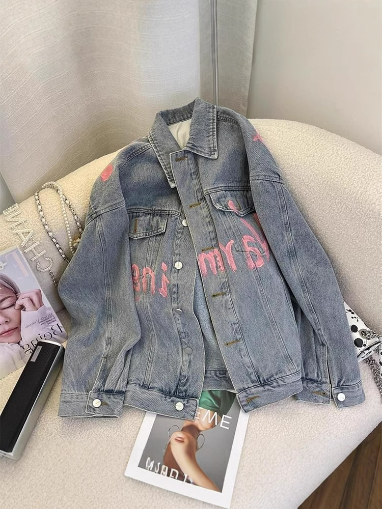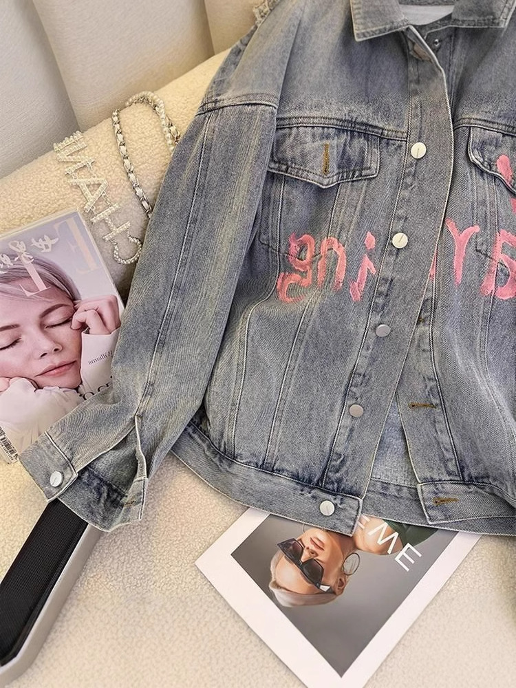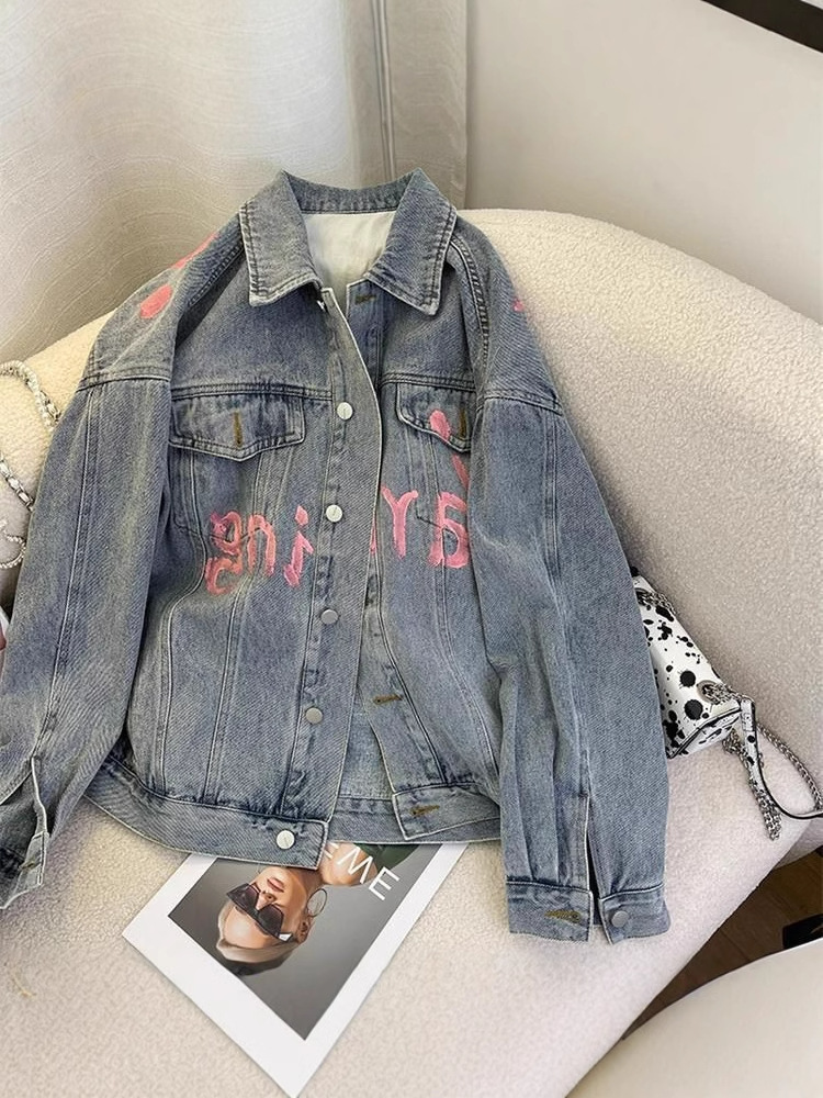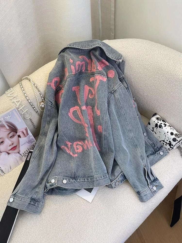 Главная страница > Европейский вокзал весенне-осенний алфавит с принтом граффити джинсовая куртка женский дизайн нишевые свободные куртки с длинными рукавами