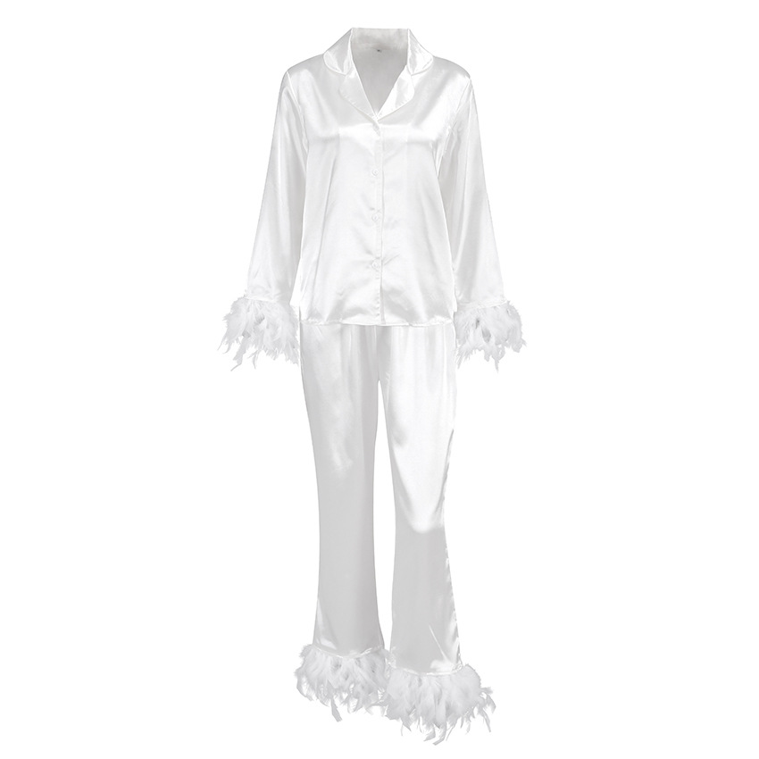 Главная страница > Осенний комплект 2025: модная пижама из ледяного шелка в европейском и американском стиле, сорочка с перьями страуса и длинные брюки, свободный крой, комплект из двух предметов для женщин