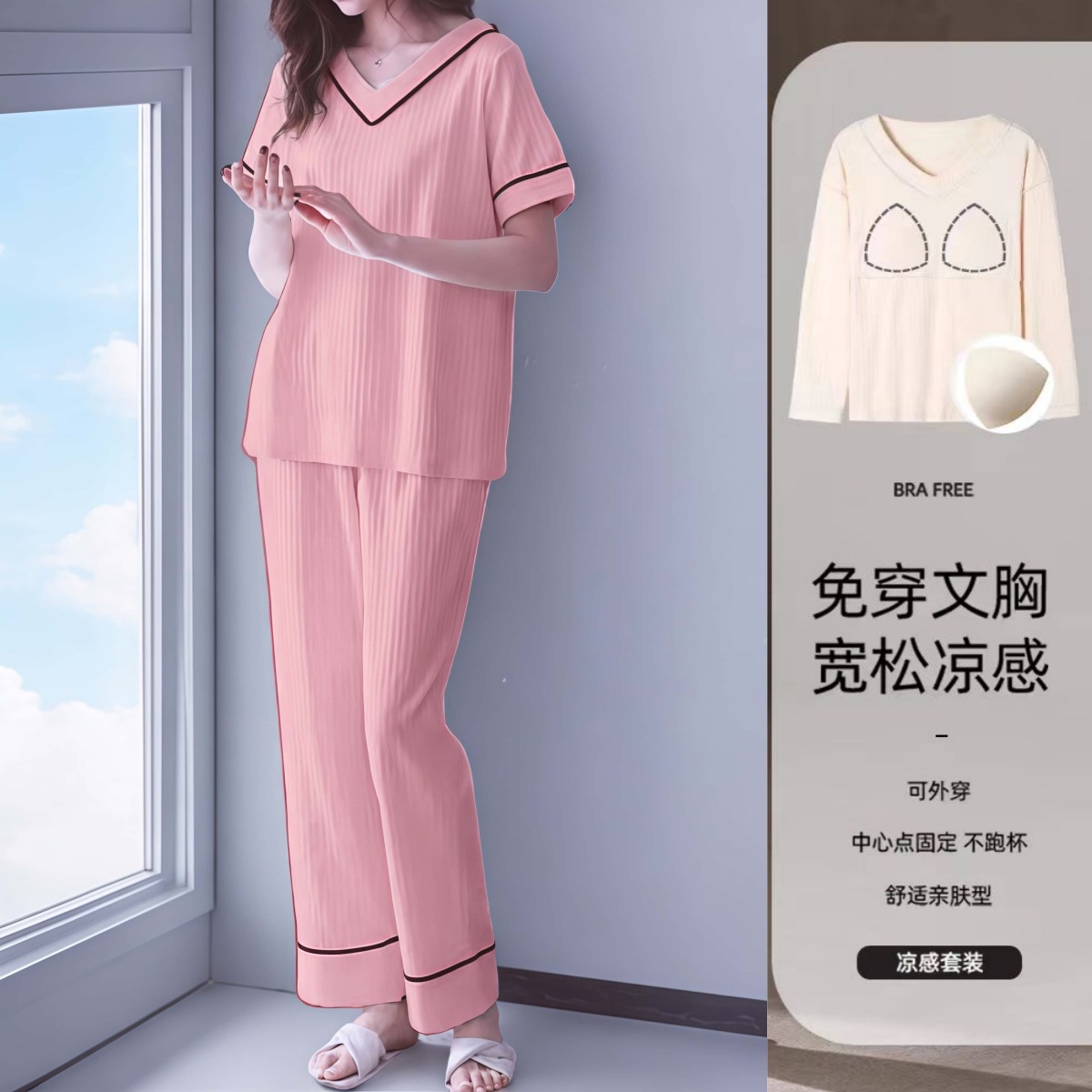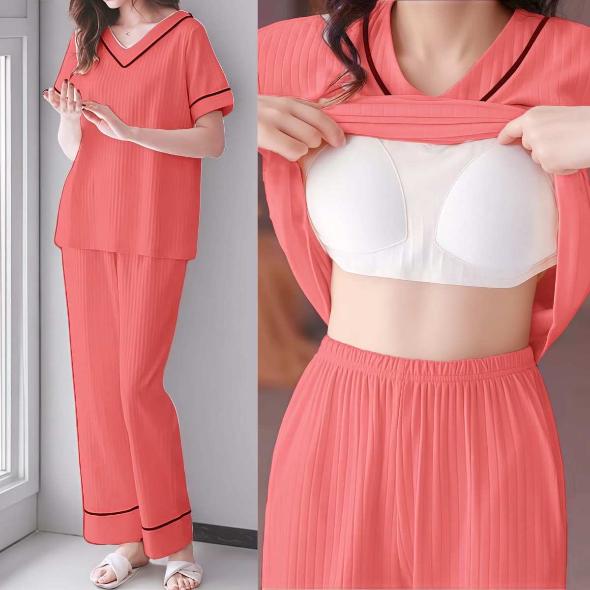 【Короткий рукав и длинные брюки】Комплект арбузно-красного цвета с V-образным вырезом и встроенными вставками для бюстгальтера — мягкая ткань, качество супермаркета