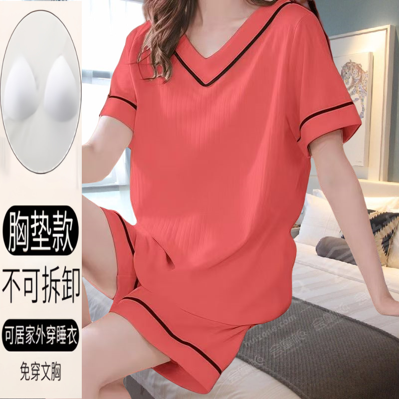 【Короткий рукав и шорты】Комплект арбузно-красного цвета с V-образным вырезом и встроенными чашками для бюстгальтера — мягкая ткань, качество супермаркета.