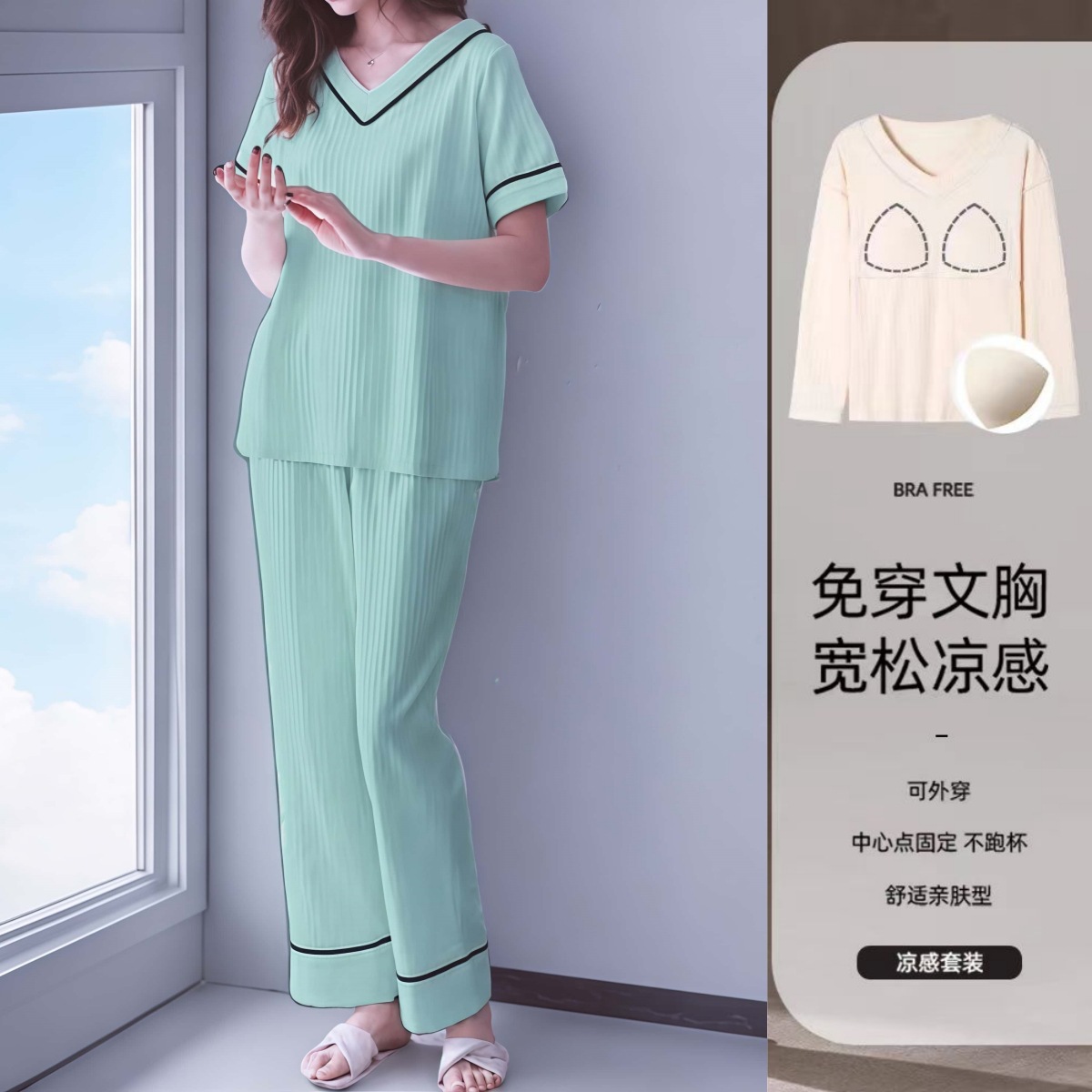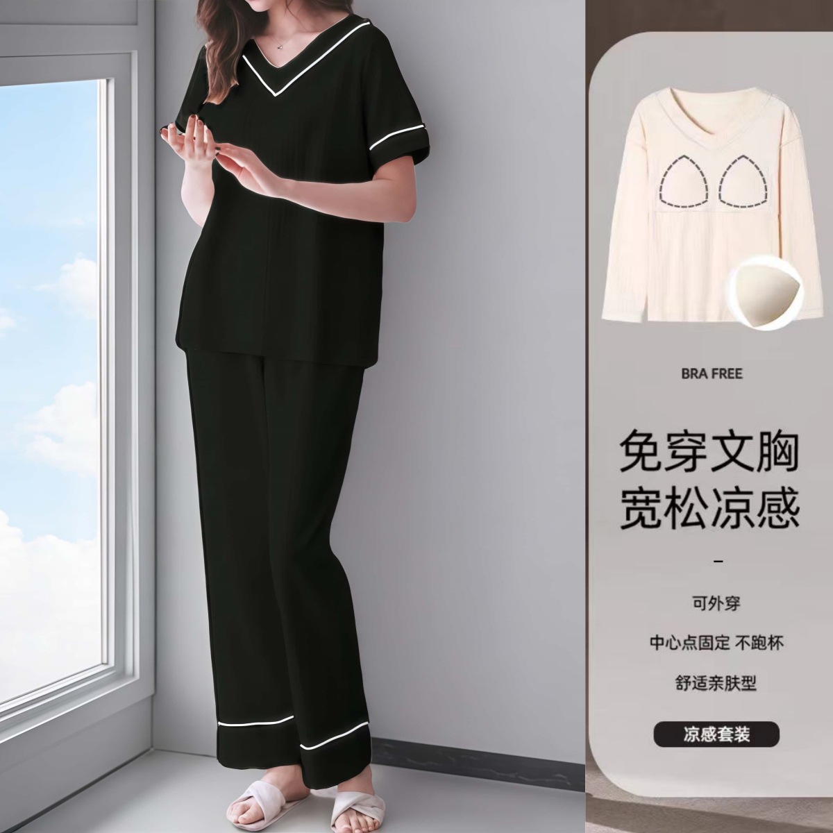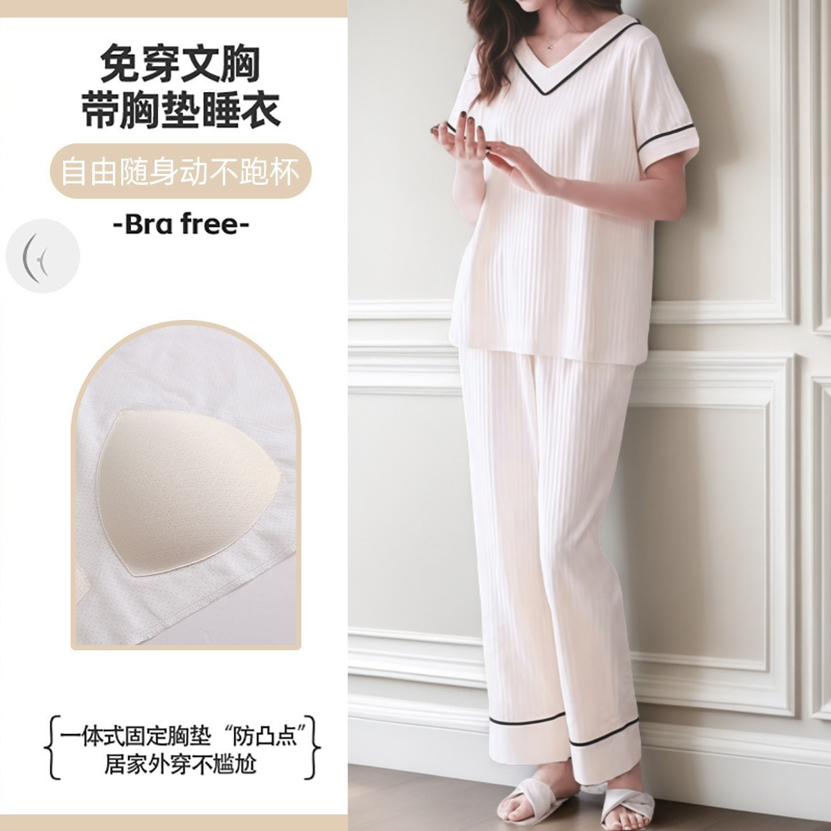 【Короткий рукав и длинные брюки】Белый комплект с V-образным вырезом и встроенными чашками для бюстгальтера — мягкая ткань, качество супермаркета