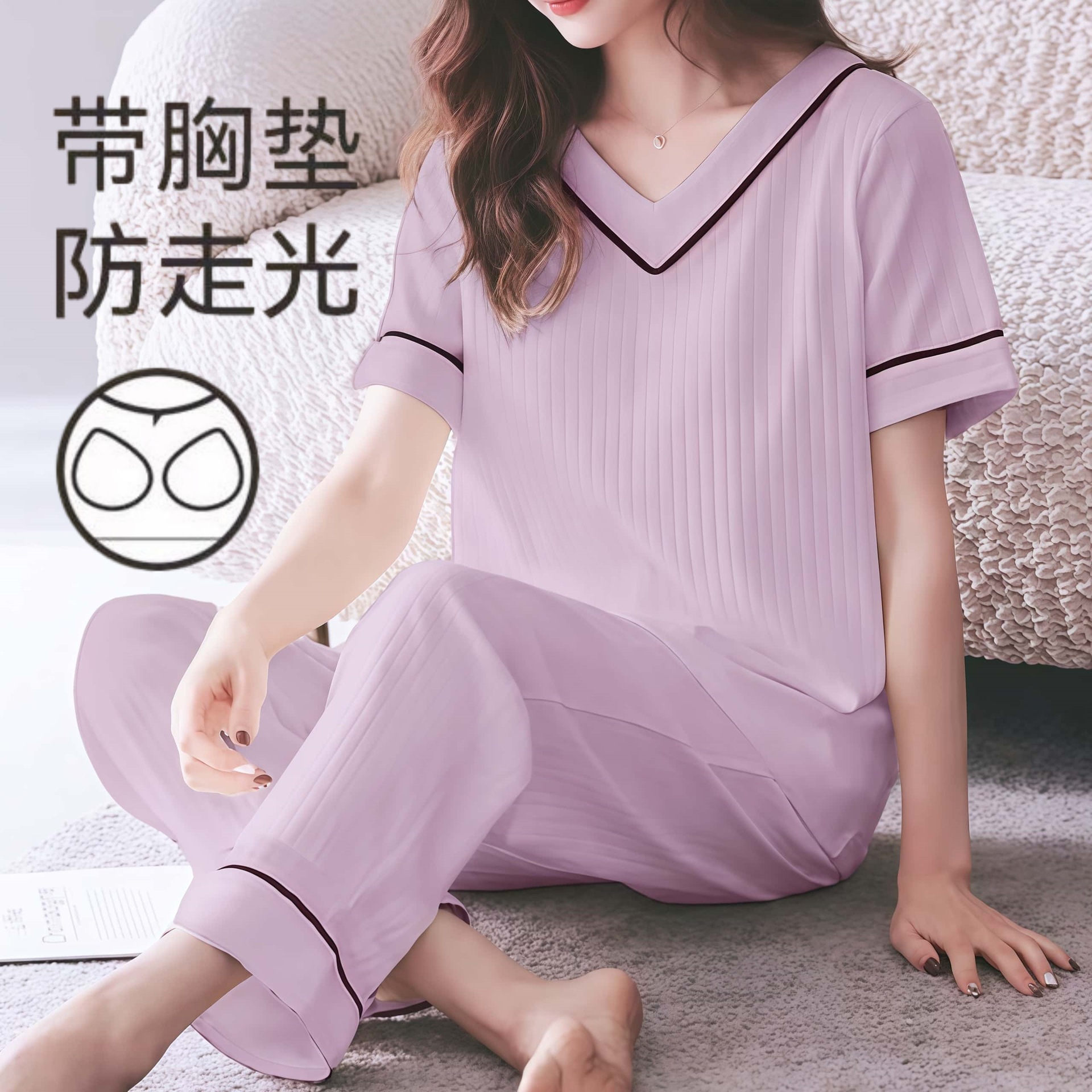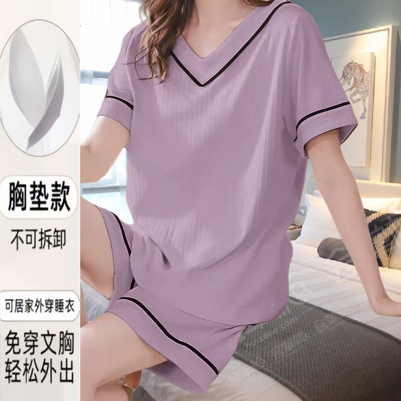 【Короткий рукав и шорты】Фиолетовый комплект с V-образным вырезом и встроенными чашками для бюстгальтера — мягкая ткань, качество супермаркета.