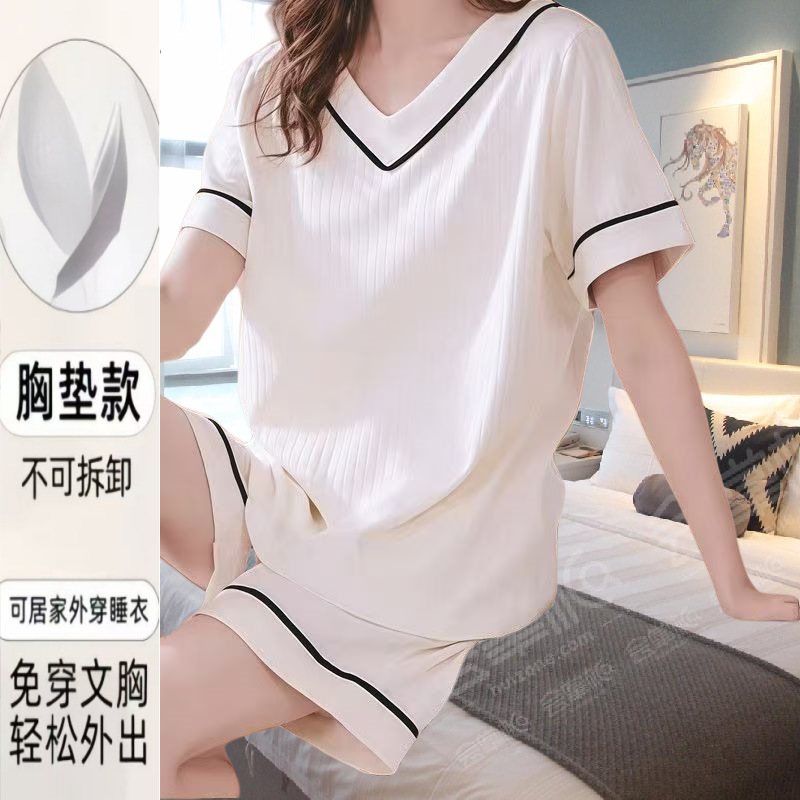 【Короткий рукав и шорты】Белый комплект с V-образным вырезом и встроенными чашками для бюстгальтера — мягкая ткань, качество супермаркета