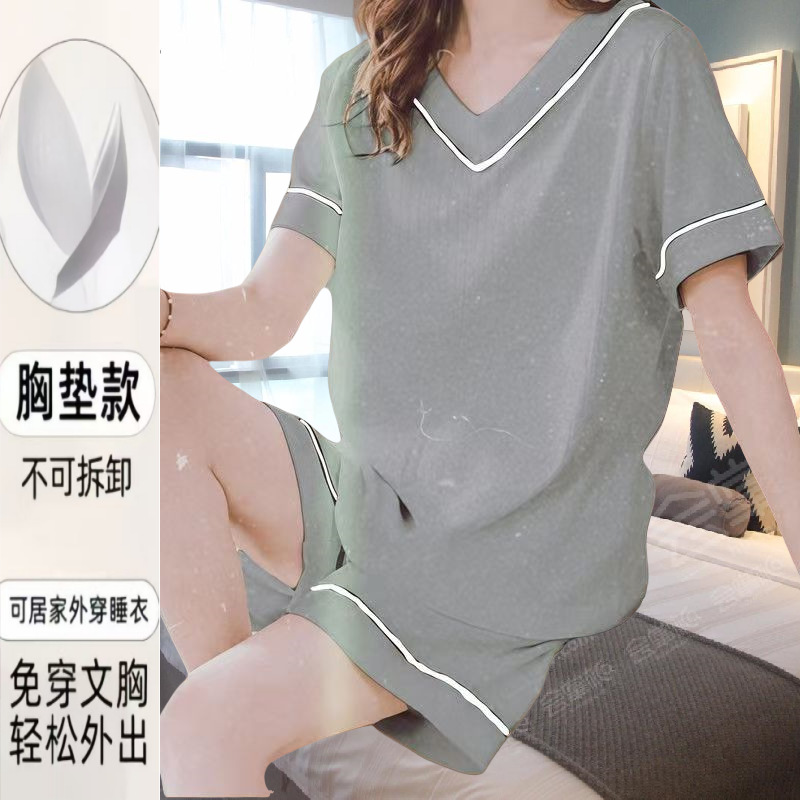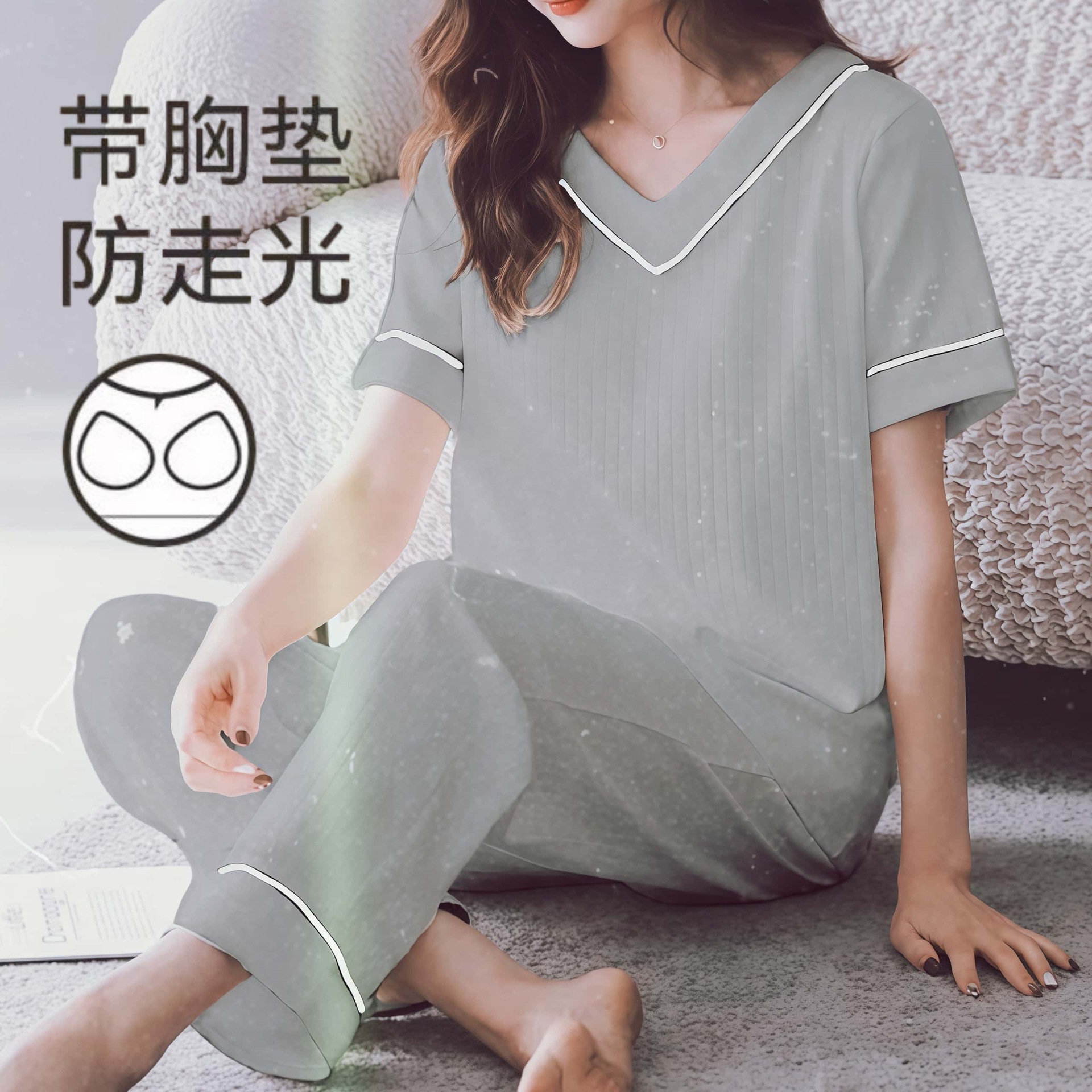 【Комплект с короткими рукавами и шортами】Серый комплект с V-образным вырезом и встроенными чашками для бюстгальтера — мягкая ткань, качество супермаркета.