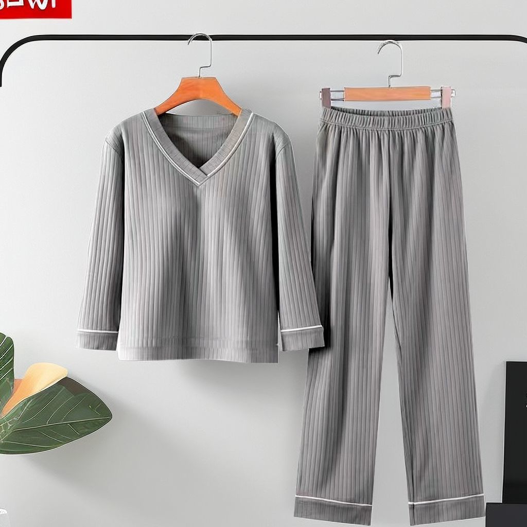 [Длинные рукава] Серый костюм с V-образным вырезом и вставкой на груди, мягкая ткань, качество супермаркета