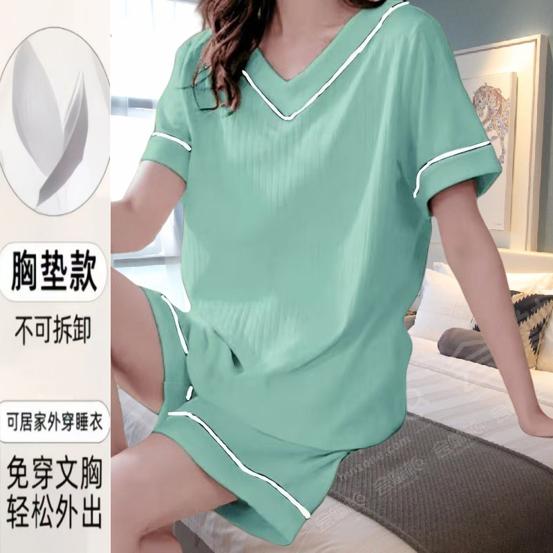 【Комплект с короткими рукавами и шортами】Зеленый наряд с V-образным вырезом и встроенными чашками бюстгальтера — мягкая ткань, качество супермаркета.