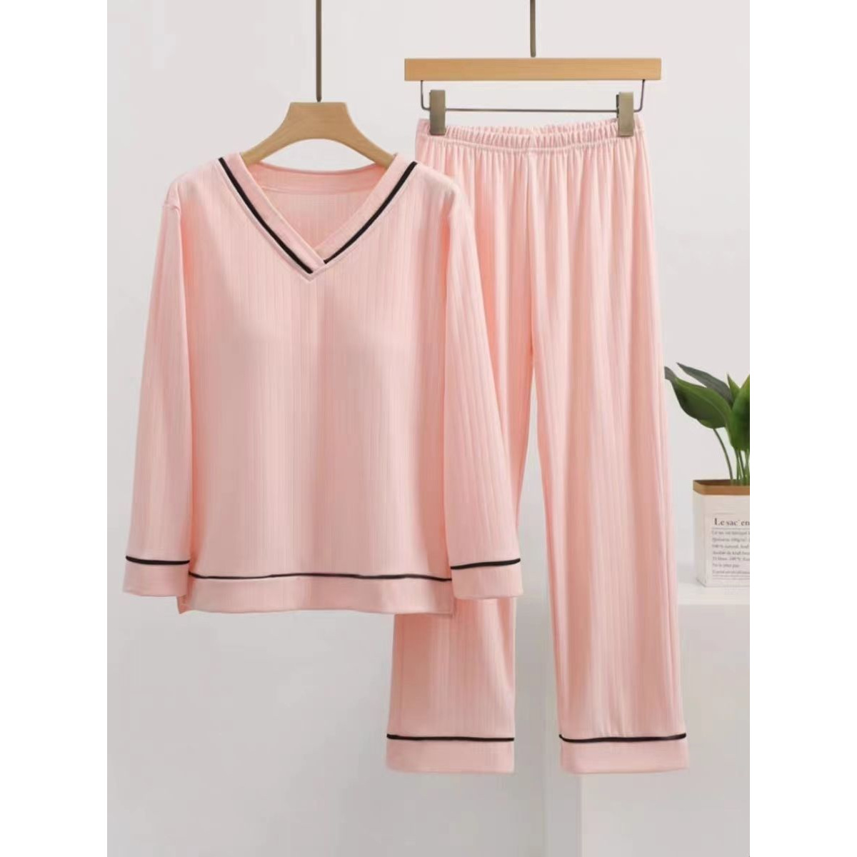 [Длинные рукава] Розовый костюм с V-образным вырезом и вставкой на груди, мягкая ткань, качество супермаркета