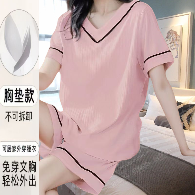 【Комплект с короткими рукавами и шортами】Розовый наряд с V-образным вырезом и встроенными чашками для бюстгальтера — мягкая ткань, качество супермаркета.